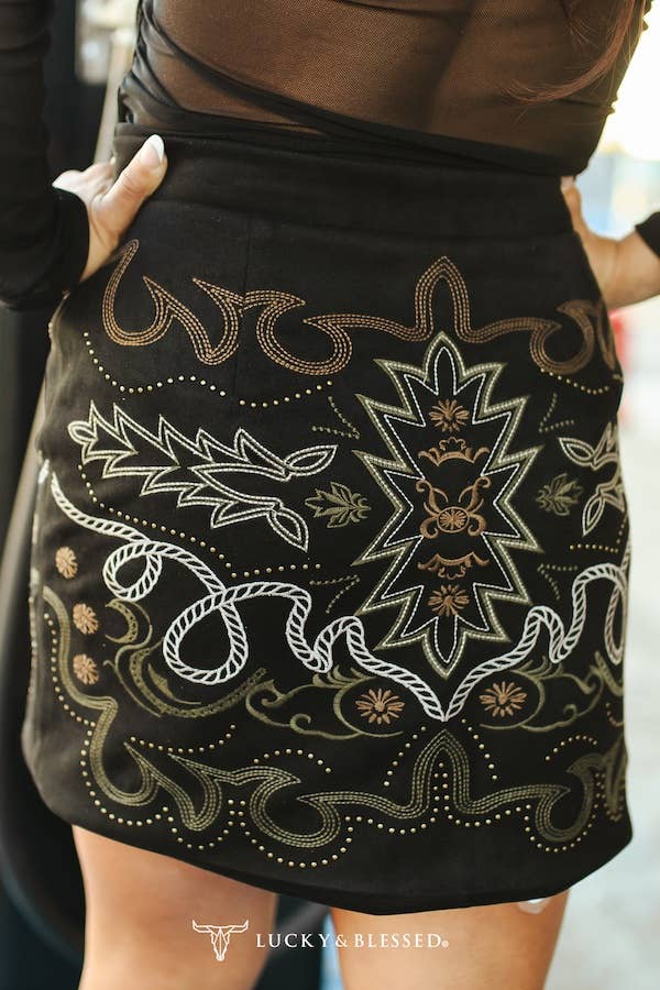 Striking, sculpted, and made for the spotlight—the Lucky & Blessed Black Embroidered Mini Skirt delivers cowgirl glam with a fierce edge. Featuring a soft suede-like finish and all-over boot stitch embroidery, this mini skirt channels the spirit of Western boots in a showstopping silhouette. The curve-hugging cut flatters the body, while the high-rise fit makes it perfect for pairing with tucked-in tops or crop tees. Designed to stand out at rodeos, country concerts, and boutique showcases, this skirt offers premium detail and Western attitude for the bold cowgirl.
