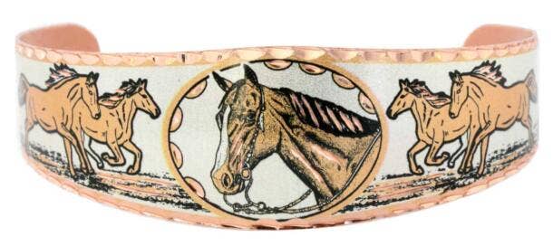 Copper bracelets are individually handcrafted on this unique horse jewelry design. Considered wild and an emblem of freedom, horses symbolize combine the power of the earth with the whispers of wisdom found in the spirit winds. The Horse has long been honored has helper, messenger, and harbinger of spirit knowledge to the Native American.