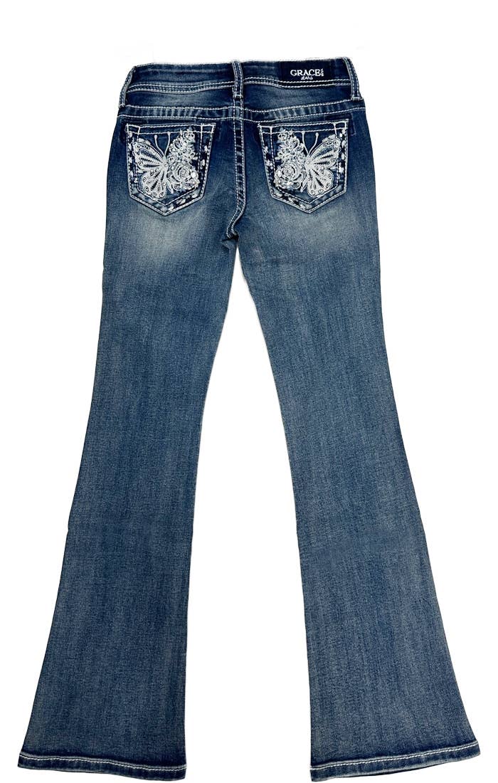 The Grace in LA girls and little girls' jeans come in different fits, we have bootcut, skinny, flare. The jeans are unique detailed with embroidery, western stich, and accent sequins. All natural washes with natural hand sanding and whickering. These jeans make every girl and little girl feel special and comfortable.