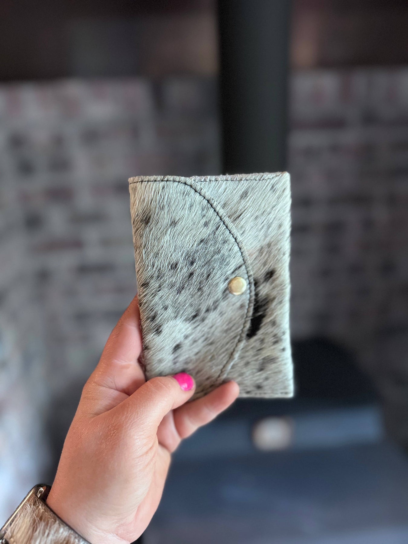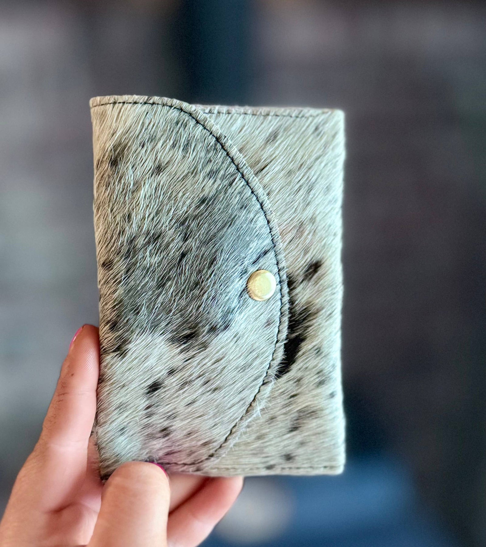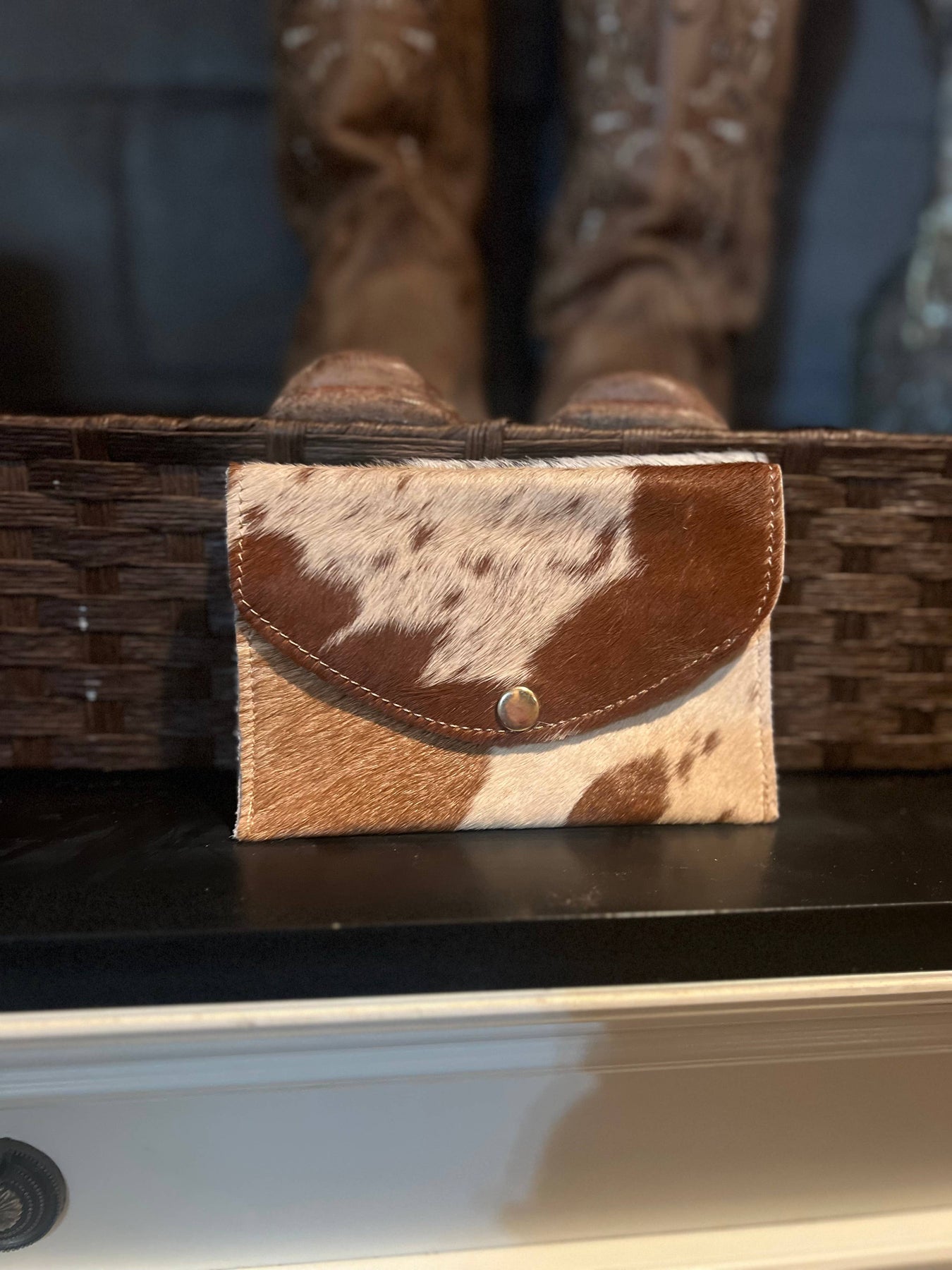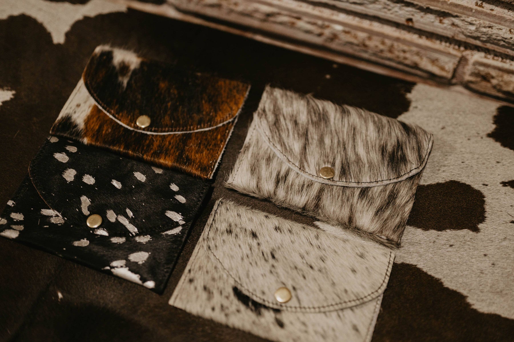 Roughly 5x3.5” One snap, natural on inside of pouch perfect for coins or business cards.