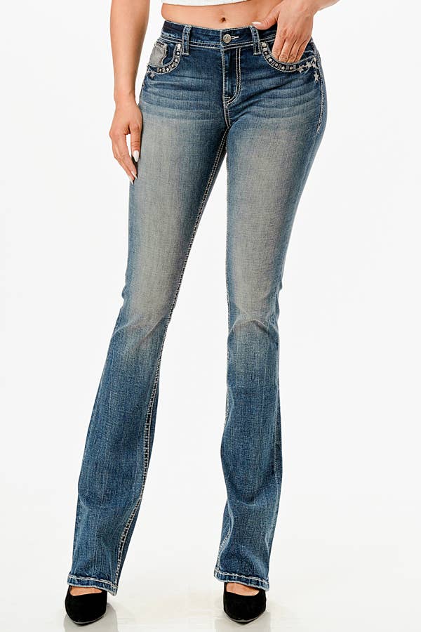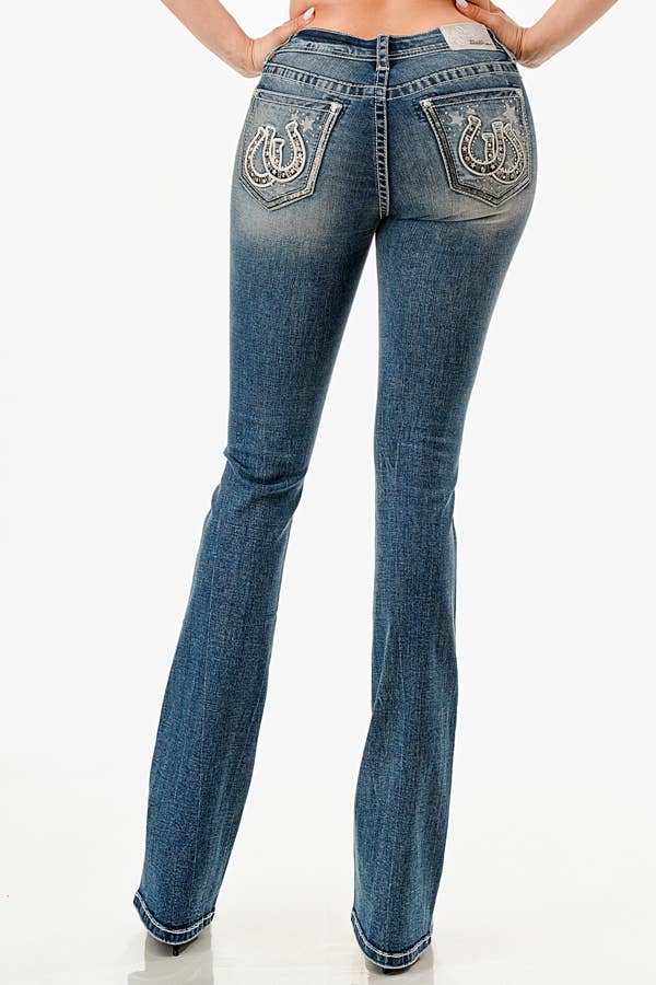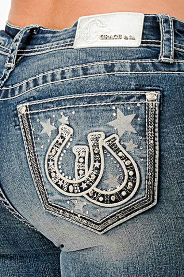 The grace in la women's bootcut jean in easy fit sits right at the waist to create a hip hugger feel on the hips and thighs. The jean is a double horse shoe detailed with the double horse shoes embroidery in medium blue wash. They look like they’ve been yours forever, with details like distressing, sanding, and whiskering. So go ahead and make it official—your new bootcut jean is just a click away.