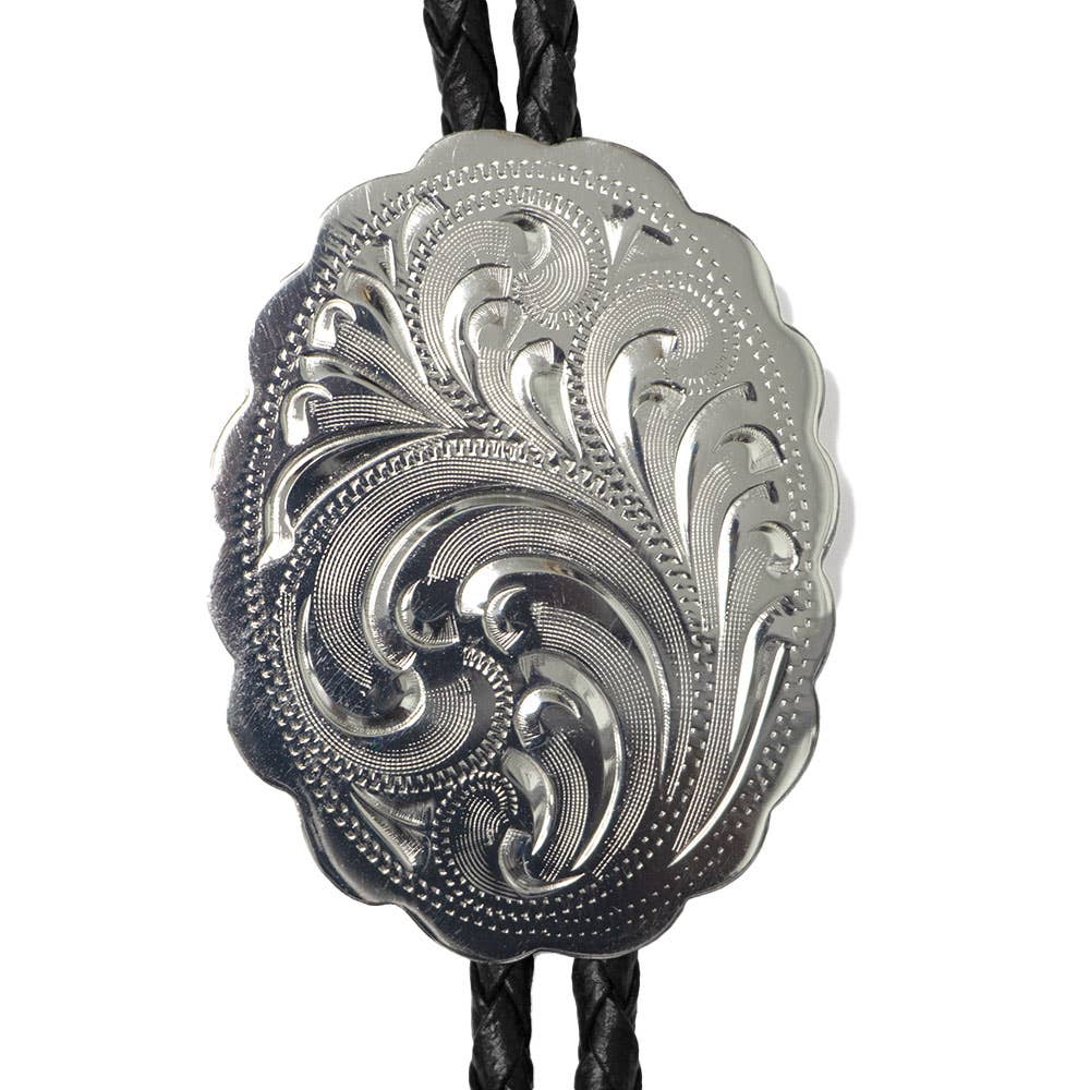 Silver tone oval bolo tie featuring western scroll engraving and scalloped edges. This bolo tie comes complete with a vinyl cord and metal tips.