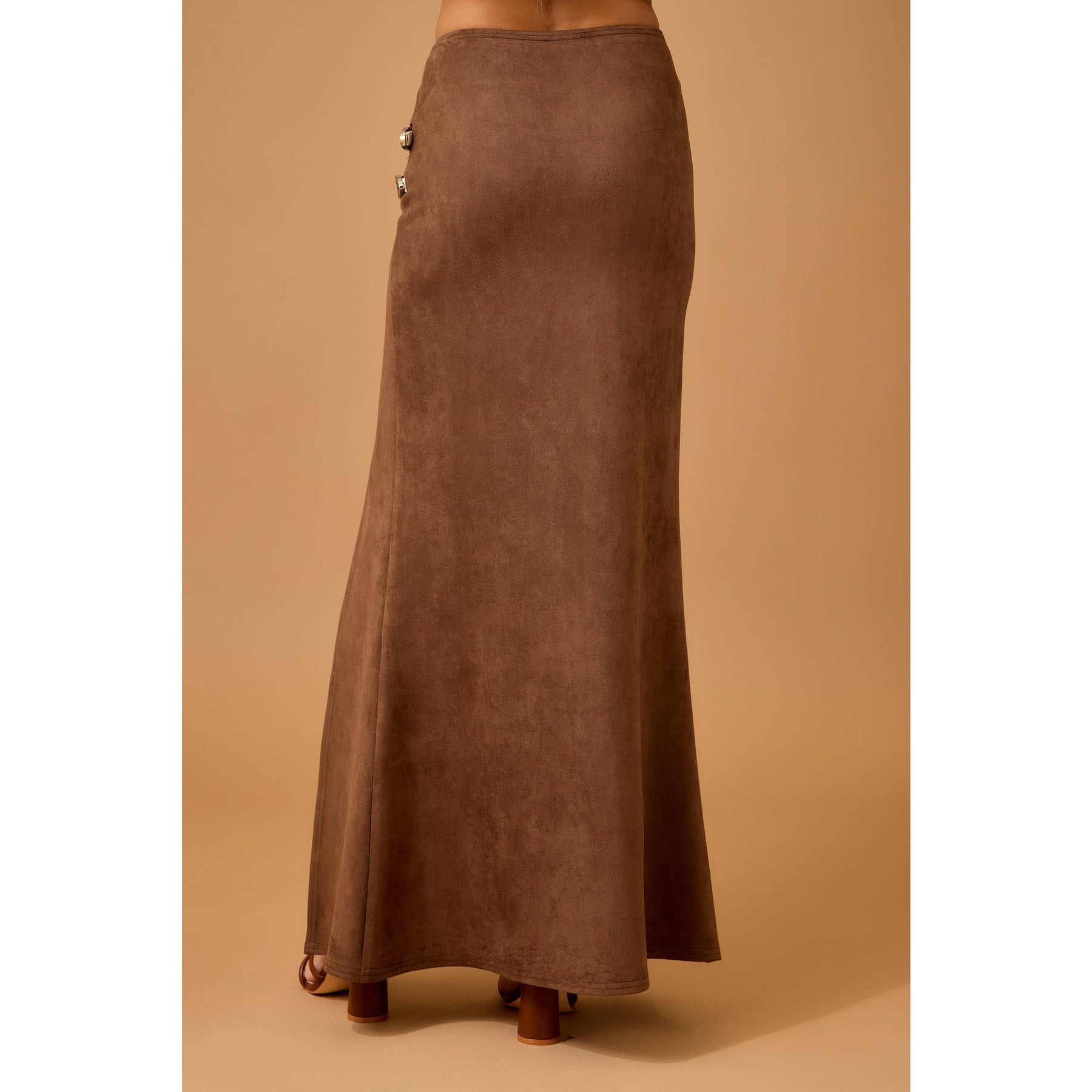 Faux Suede Maxi Skirt with High Slit and Double Buckles