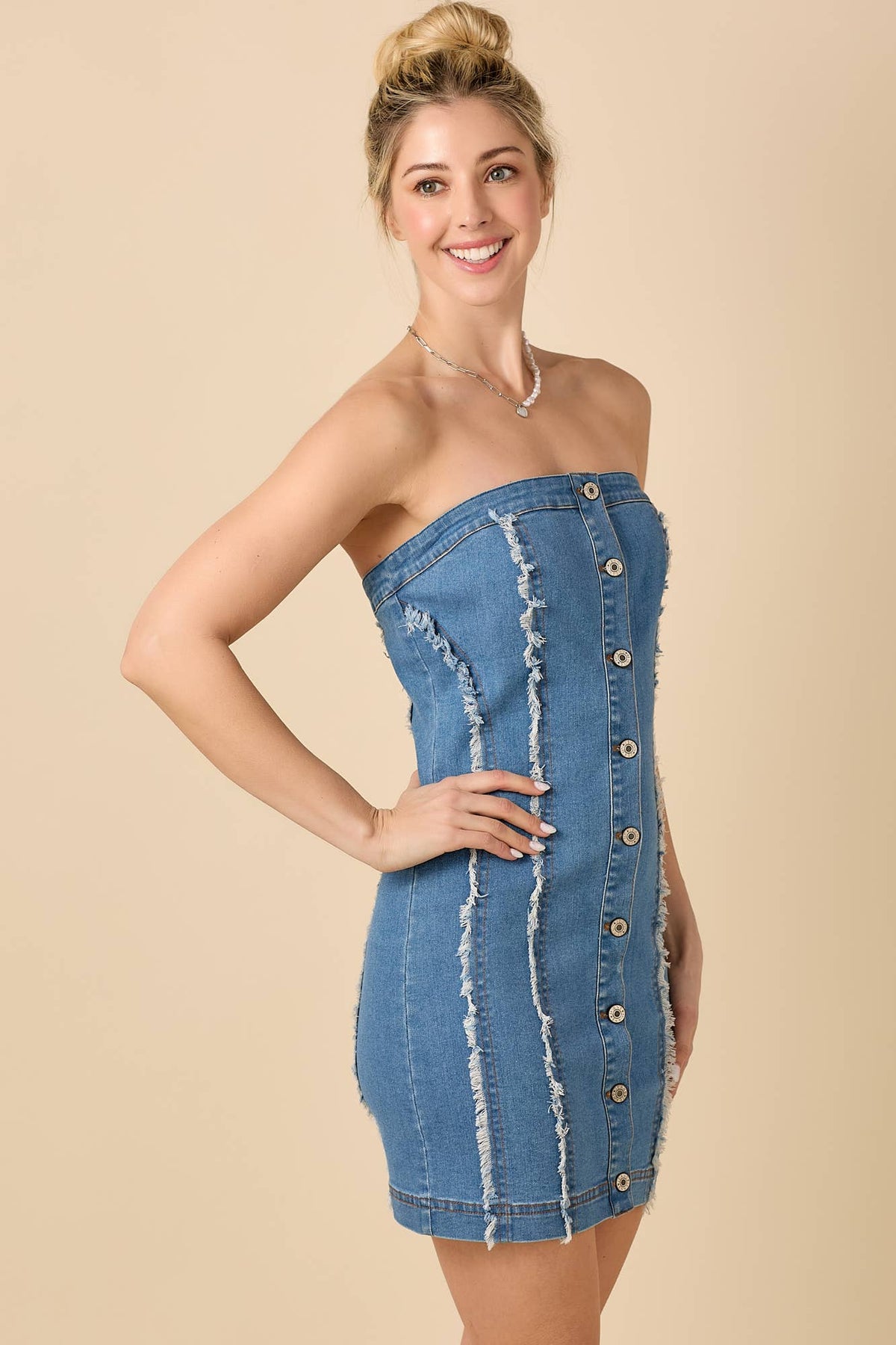 - Front button down Denim dress with frayed detailing