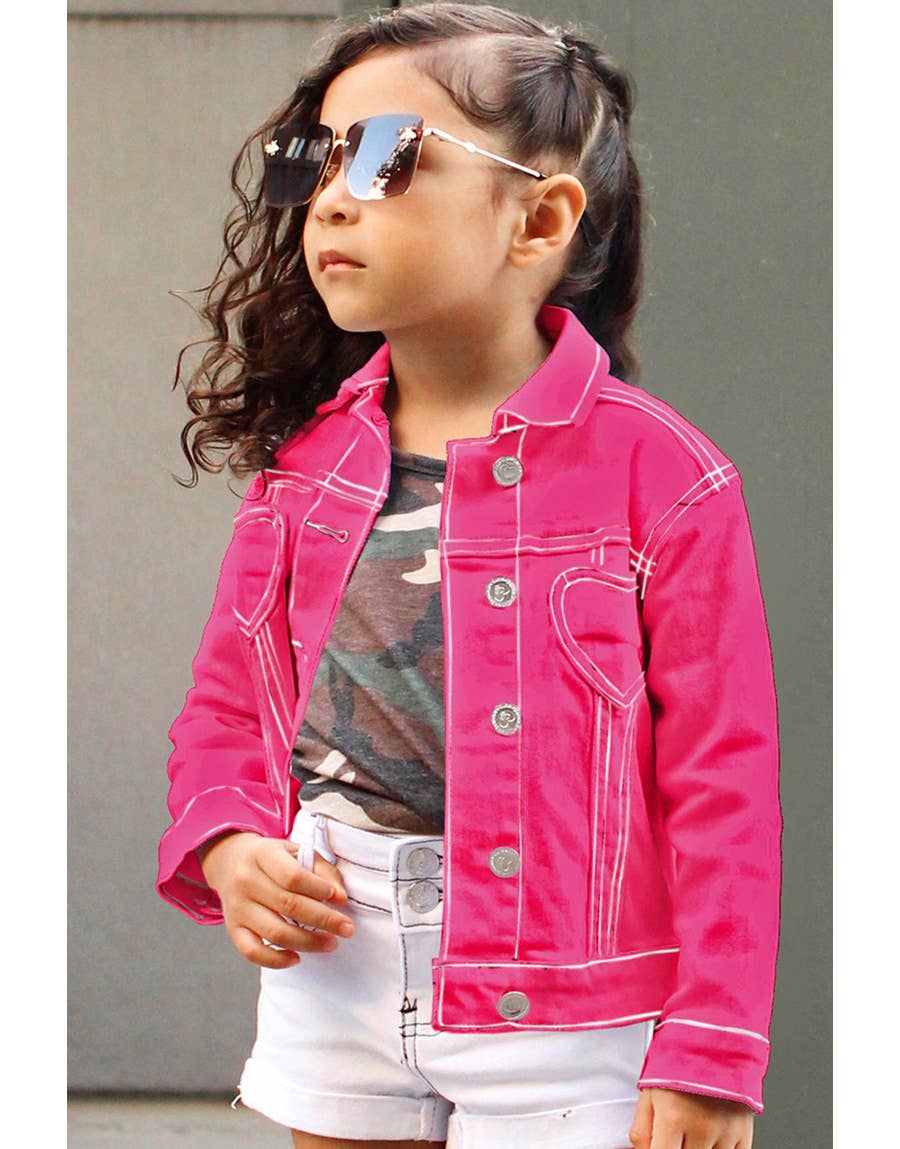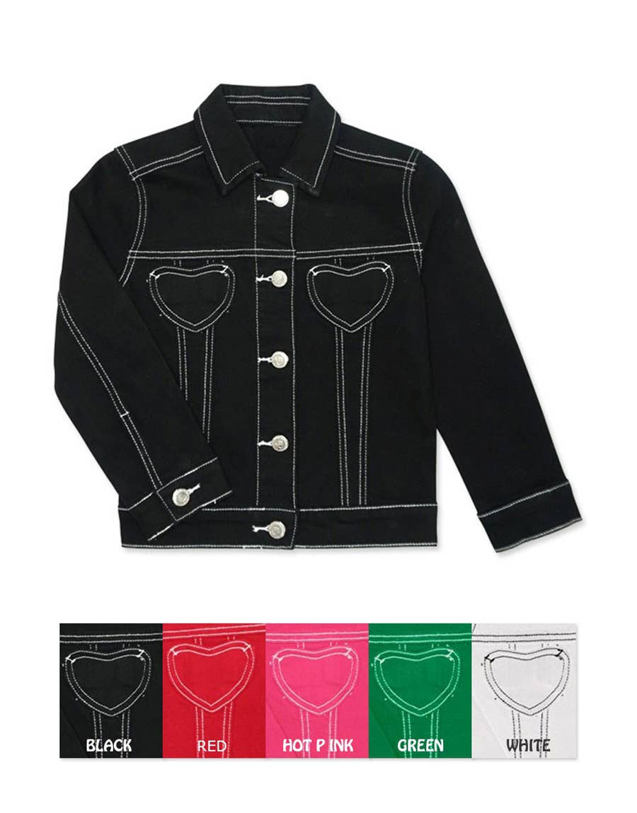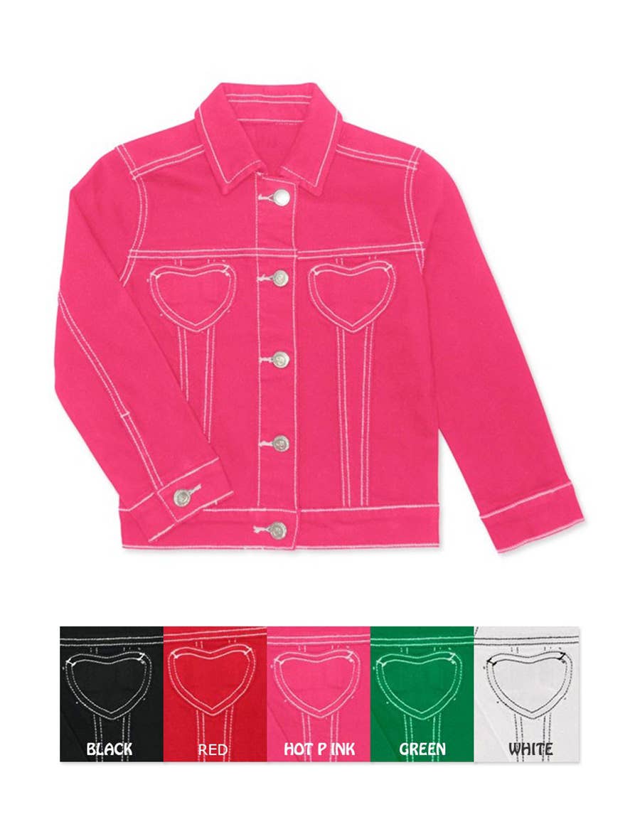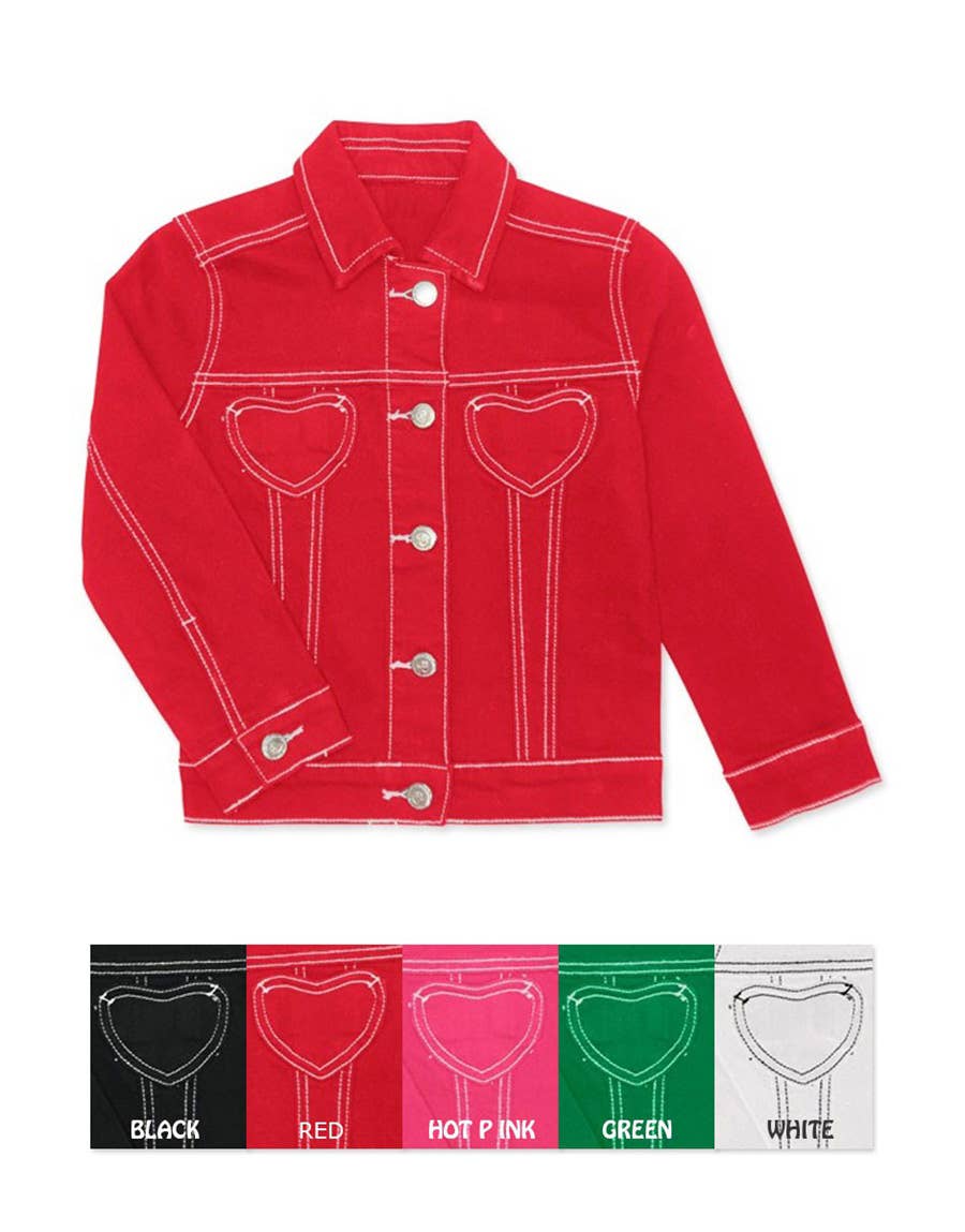 Girl's Colored Wash Stretch Denim Jacket w/ Heart pockets & Contrast Stitching Also available in different size packages: -Pack T: Toddler (2T-4T) -Pack A: Little Girls (4-6X) -Pack B: Tweens (7-14)
