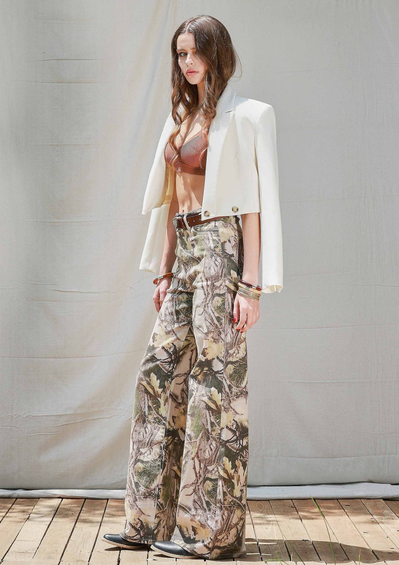 A pair of high-rise wide leg jeans featuring all over camo print, a classic 5-pocket construction and a zip-fly closure.