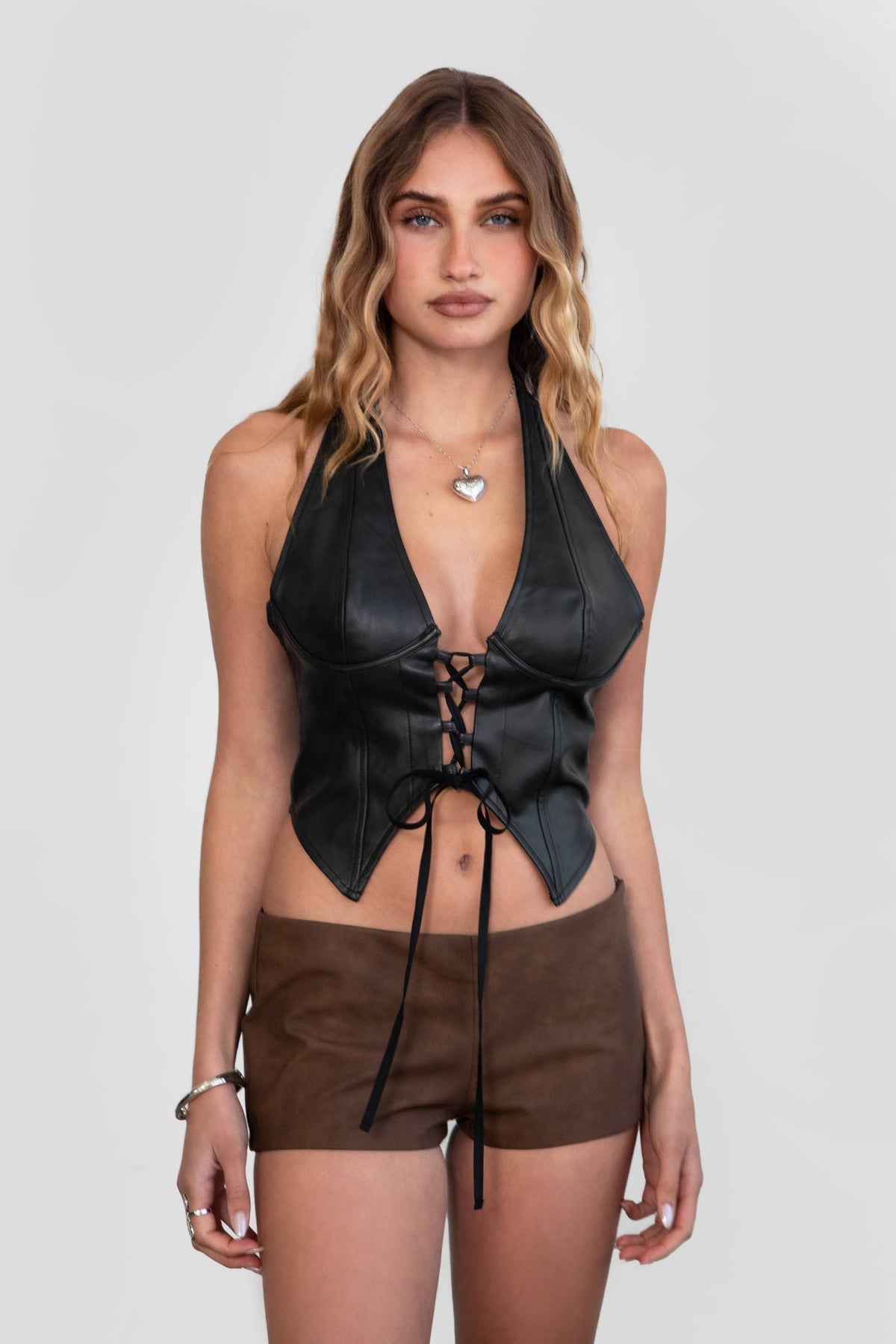 LEIAH PU Vegan Leather Low Rise Zipper Closure Micro Shorts