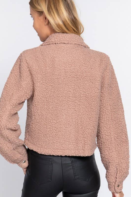 LONG SLEEVE POCKET FLAP DETAIL BUTTON DOWN FAUX FUR JACKET