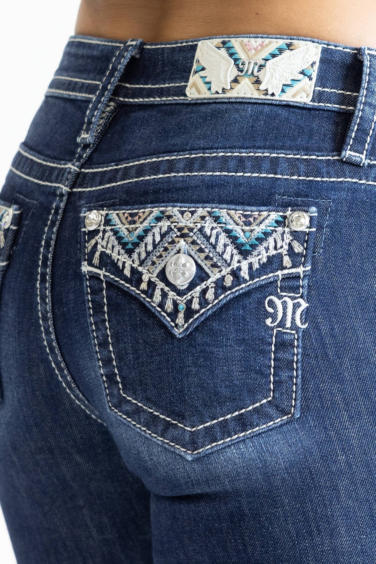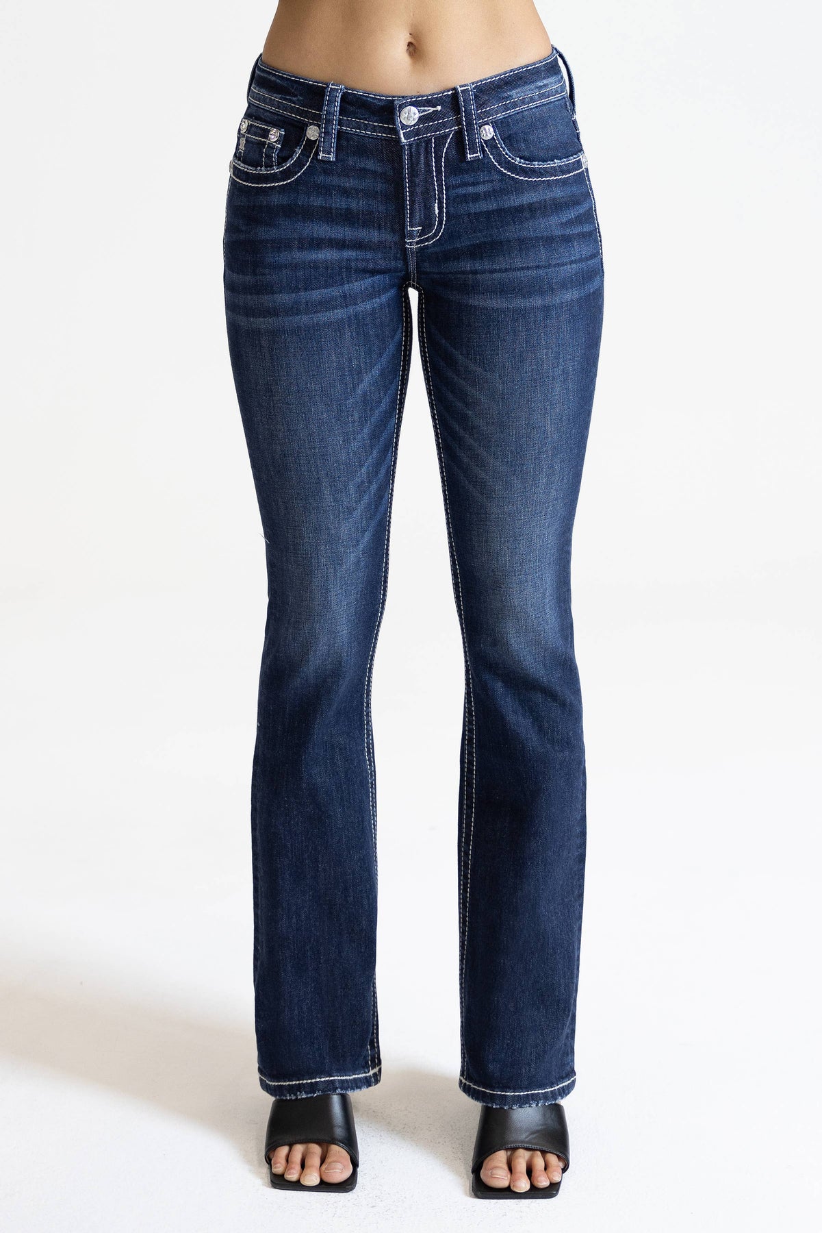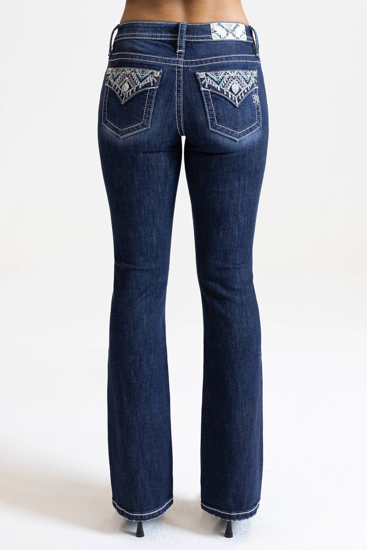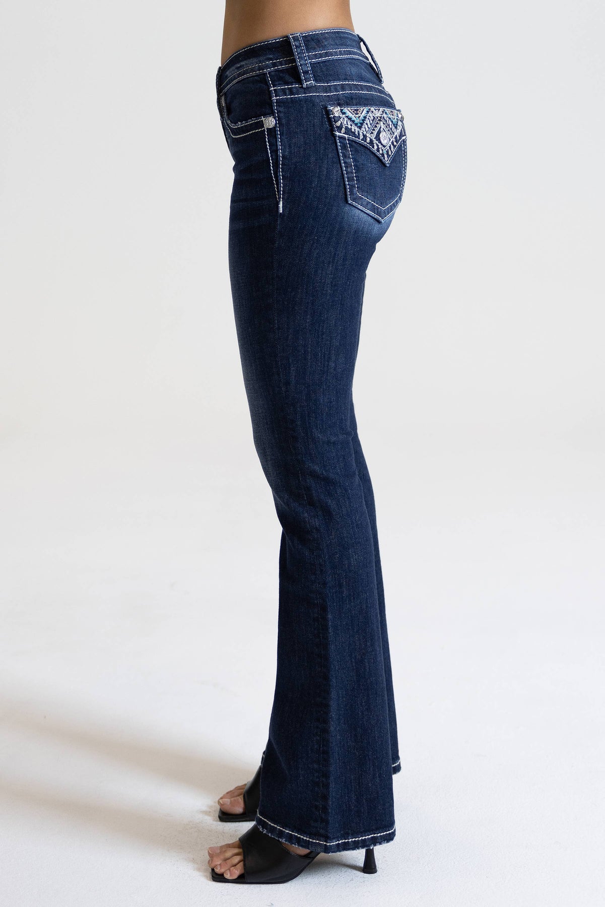 32" Inseam Mid-Rise Bootcut Denim in Dark Blue with Embroidered Pattern Pocket FW24