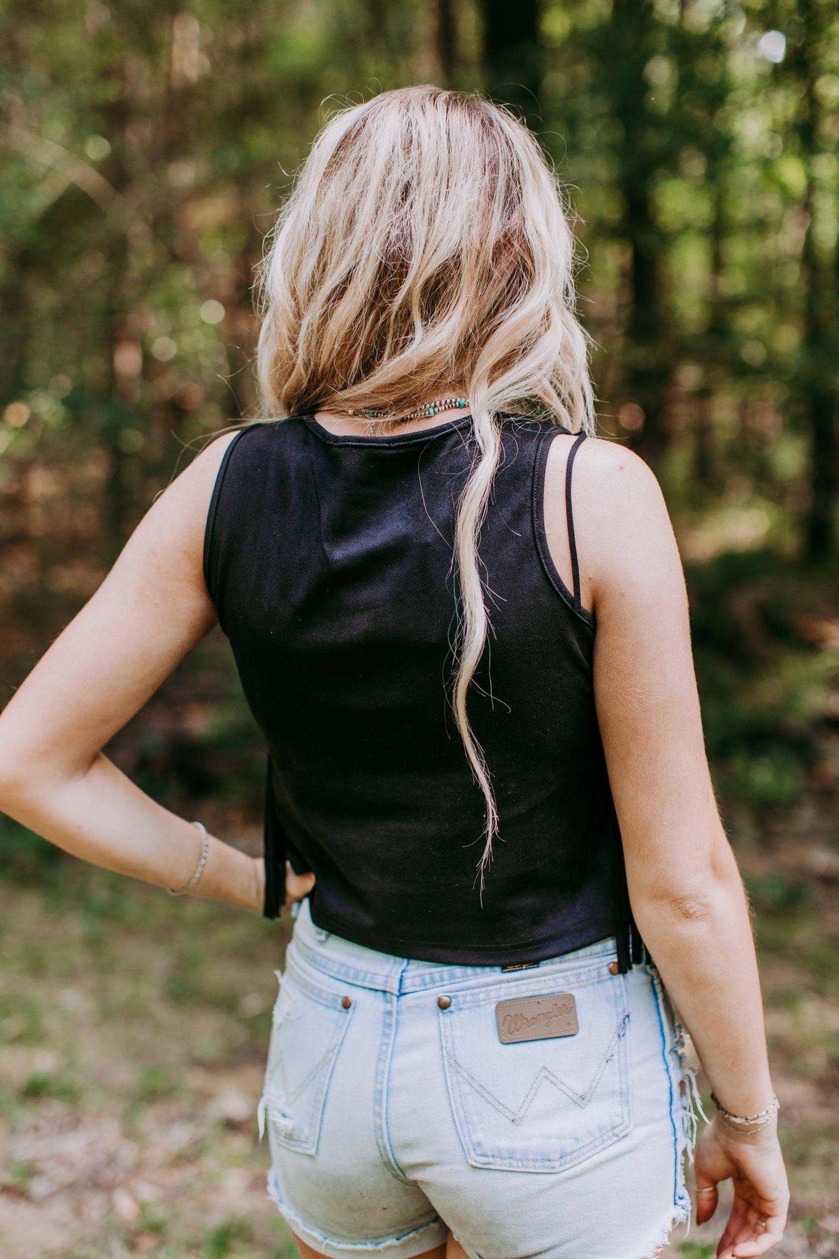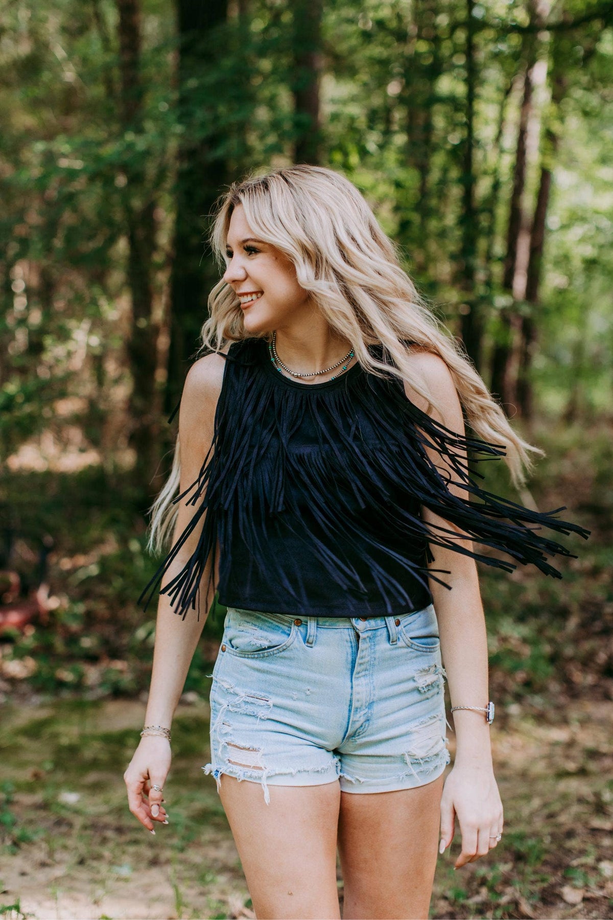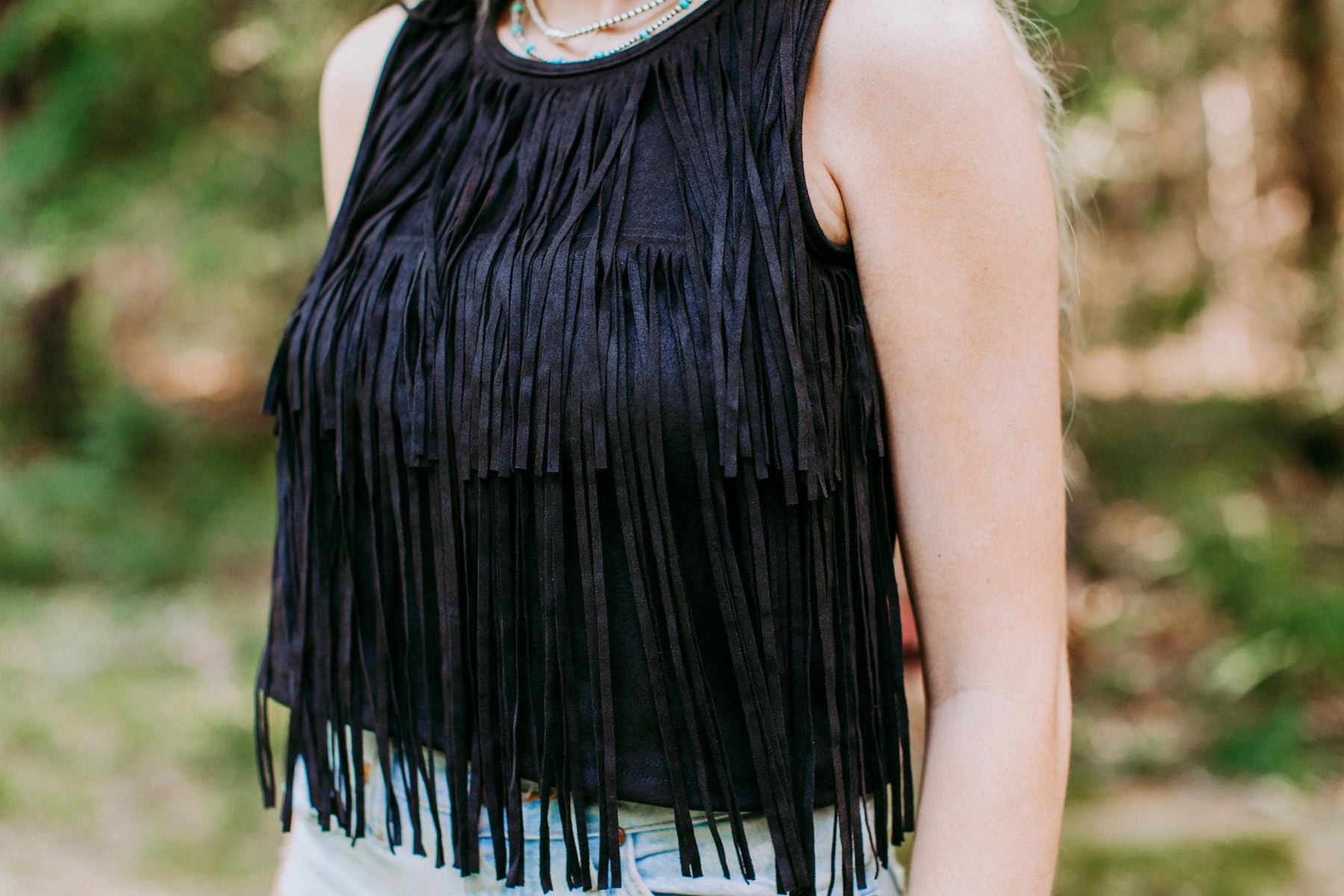 Introducing the MK373 Suede Fringe Top in Black from Merigold Kiss. Made from a comfortable blend of 92% polyester and 8% spandex, this knit top is a must-have. It features a suede texture and fringe detail. Merigold Kiss, a family-owned Texas-based brand, offers high-quality, western-inspired lifestyle clothing.