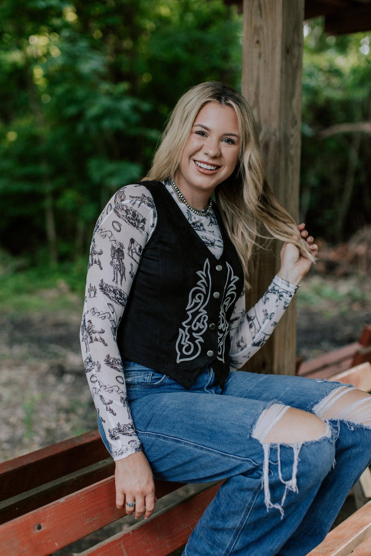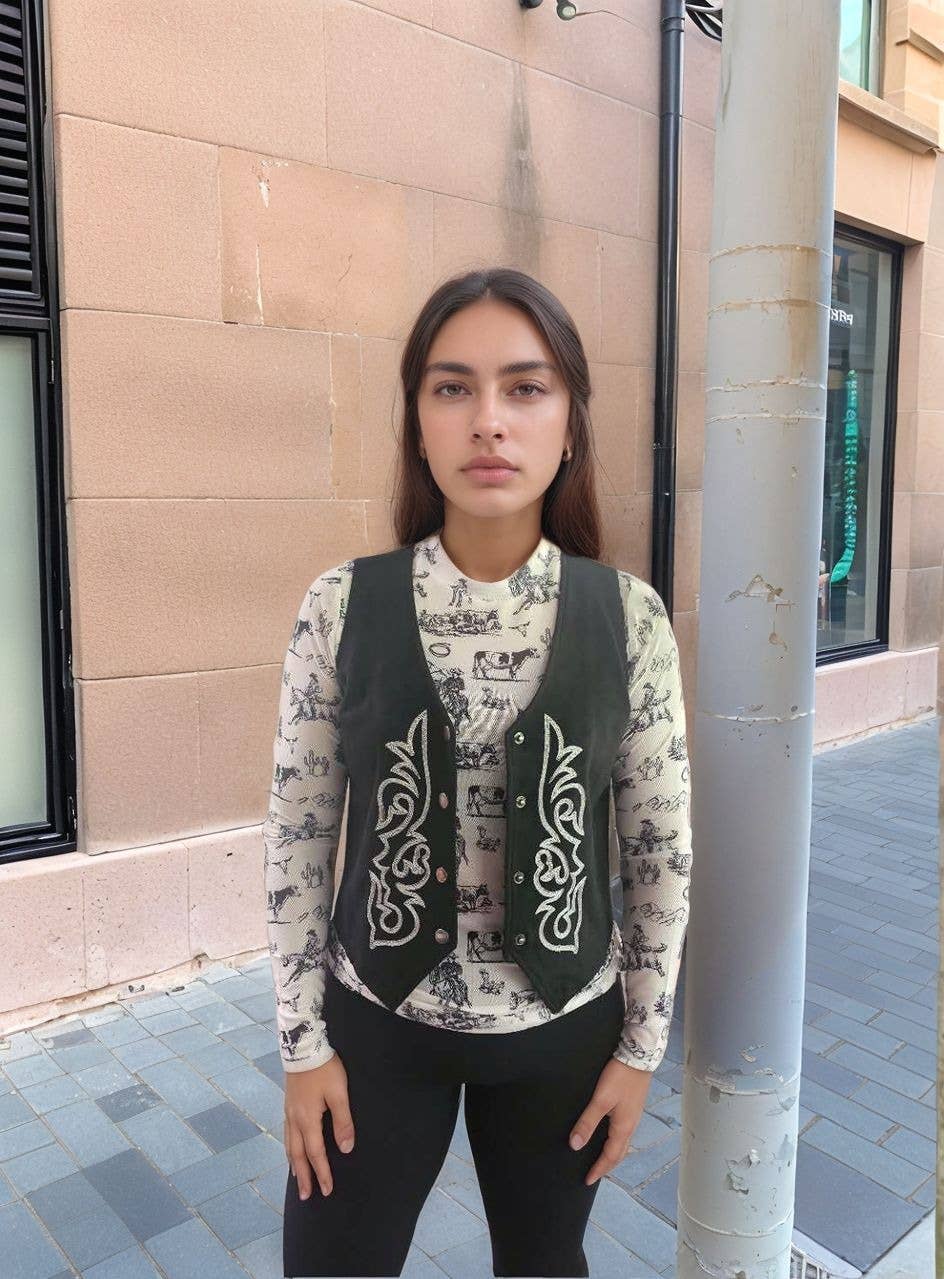 Our MK807 Boot Stitch Vest is a beautiful blend of style and comfort, brought to you by Merigold Kiss. This vest exemplifies western apparel at its finest, featuring a distinctive boot stitch design. As a part of our outerwear collection for women, this vest is an ideal addition to your wardrobe, offering a unique touch to any outfit. Enjoy the quality and attention to detail that is synonymous with our family-owned Texas-based brand.
