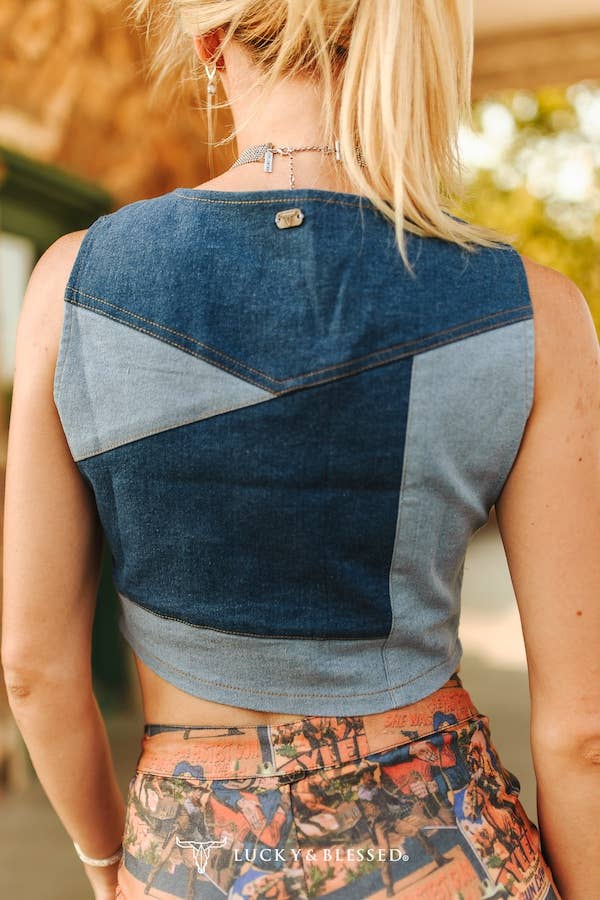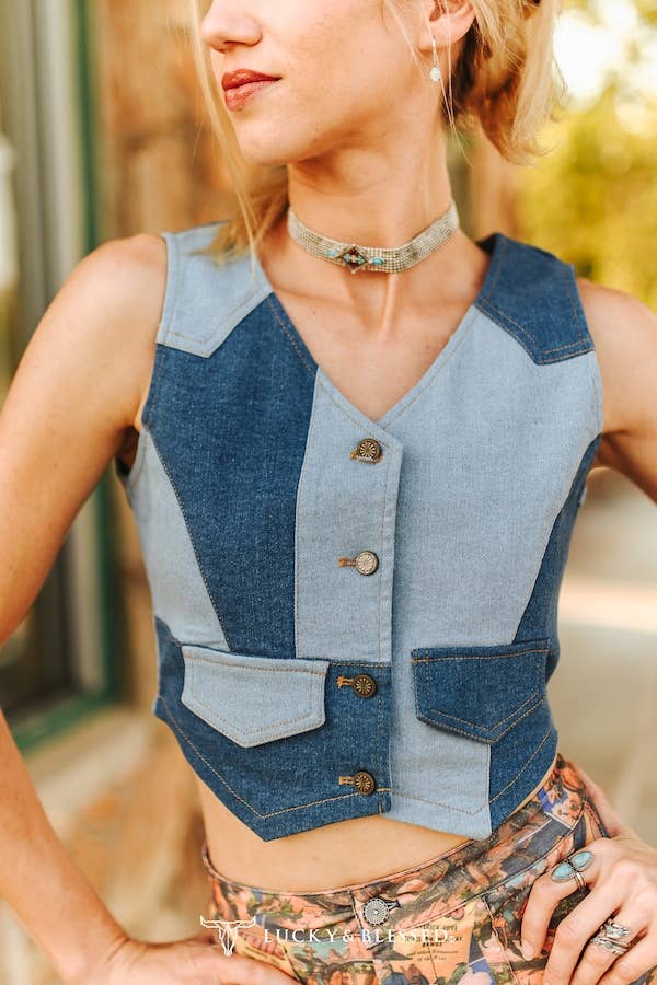 Turn heads with our Western Patchwork Denim Cropped Vest, designed for the bold, stylish cowgirl. Crafted from mixed-wash denim panels, this sleeveless V-neck vest features a flattering cropped silhouette, button-down front, and angled flap pockets for a vintage-inspired vibe. The sharp panel lines and two-tone patchwork detailing bring a modern edge to this Western classic. Whether styled with printed rodeo pants or a classic concho belt and skirt, this vest is a standout piece for rodeo season, concerts, or everyday boutique chic. Wholesale buyers: this trendy denim vest is a must-have for your boutique's Fall 2025 Western collection.