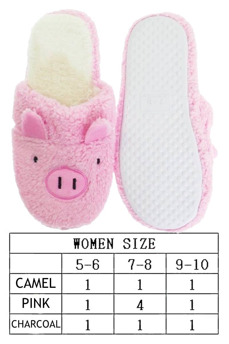 Piggy Terry Fleece Foam PVC Sole Indoor Lounge Slipper Slides - Assorted Color (6-Pink, 3-Camel, 3-Charcoal, May Vary) * Assorted Size Pack Breakdown: - 3 pc: US Women's 5-6 AKA S (1-Pink, 1-Camel, 1-Charcoal) - 6 pc: US Women's 7-8 AKA M (4-Pink, 1-Camel, 1-Charcoal) - 3 pc: US Women's 9-10 AKA L (1-Pink, 1-Camel, 1-Charcoal) Warm Winter Slides for Indoor Lounge Use -100% Polyester -CA Prop 65 Advisory Warm Winter Slides for Indoor Lounge Use