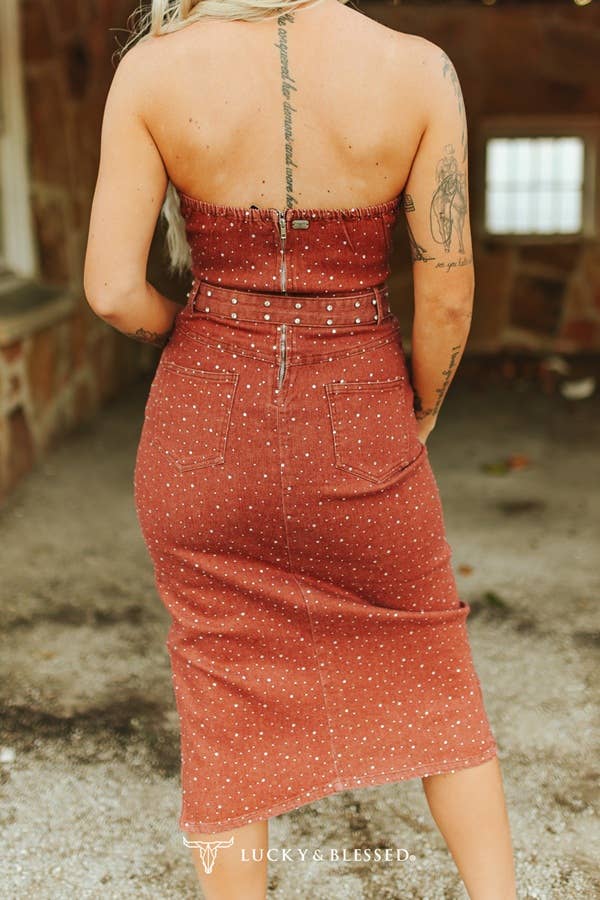Make a bold Western fashion statement with our Rhinestone Studded Strapless Denim Midi Dress in Red, designed exclusively for the modern cowgirl with edge and elegance. This fitted midi-length silhouette hugs curves while the allover rhinestone embellishments add just the right amount of sparkle. Featuring a back-zip closure, structured bodice, slit front hem for ease of movement, and functional back pockets, this dress delivers both function and flair. The standout accessory is the matching denim belt with silver stud detailing and a statement buckle, perfectly cinching the waist for a flattering finish. Whether styled with Western boots or heels, this show-stopping dress is perfect for rodeo nights, boutique events, or seasonal retail displays. Ideal for Western women's wholesale buyers looking for standout pieces.