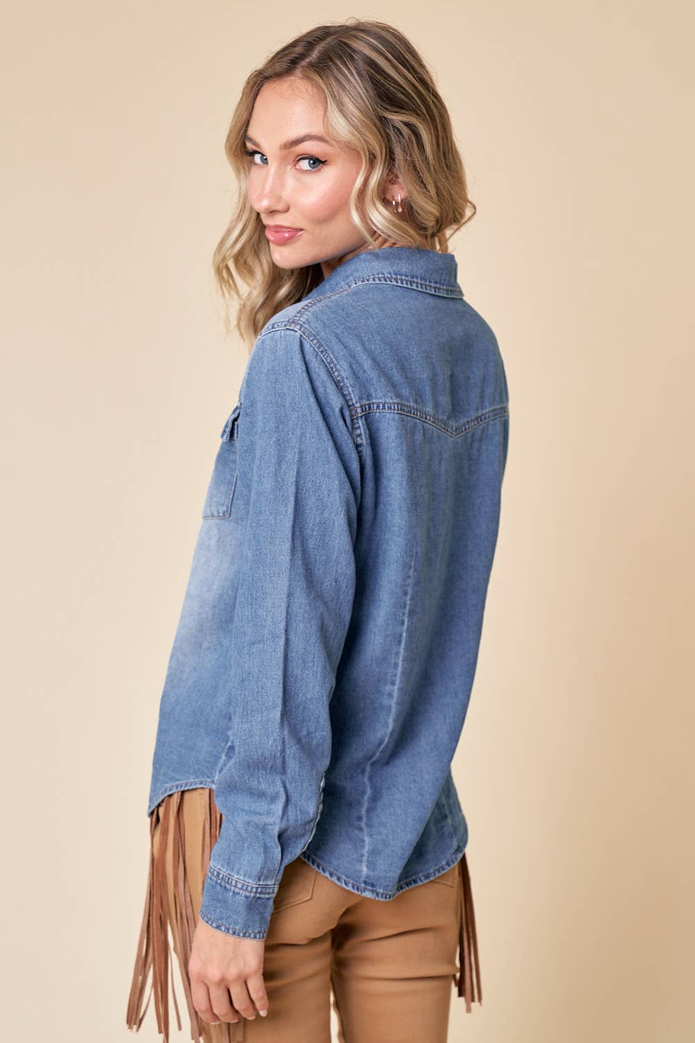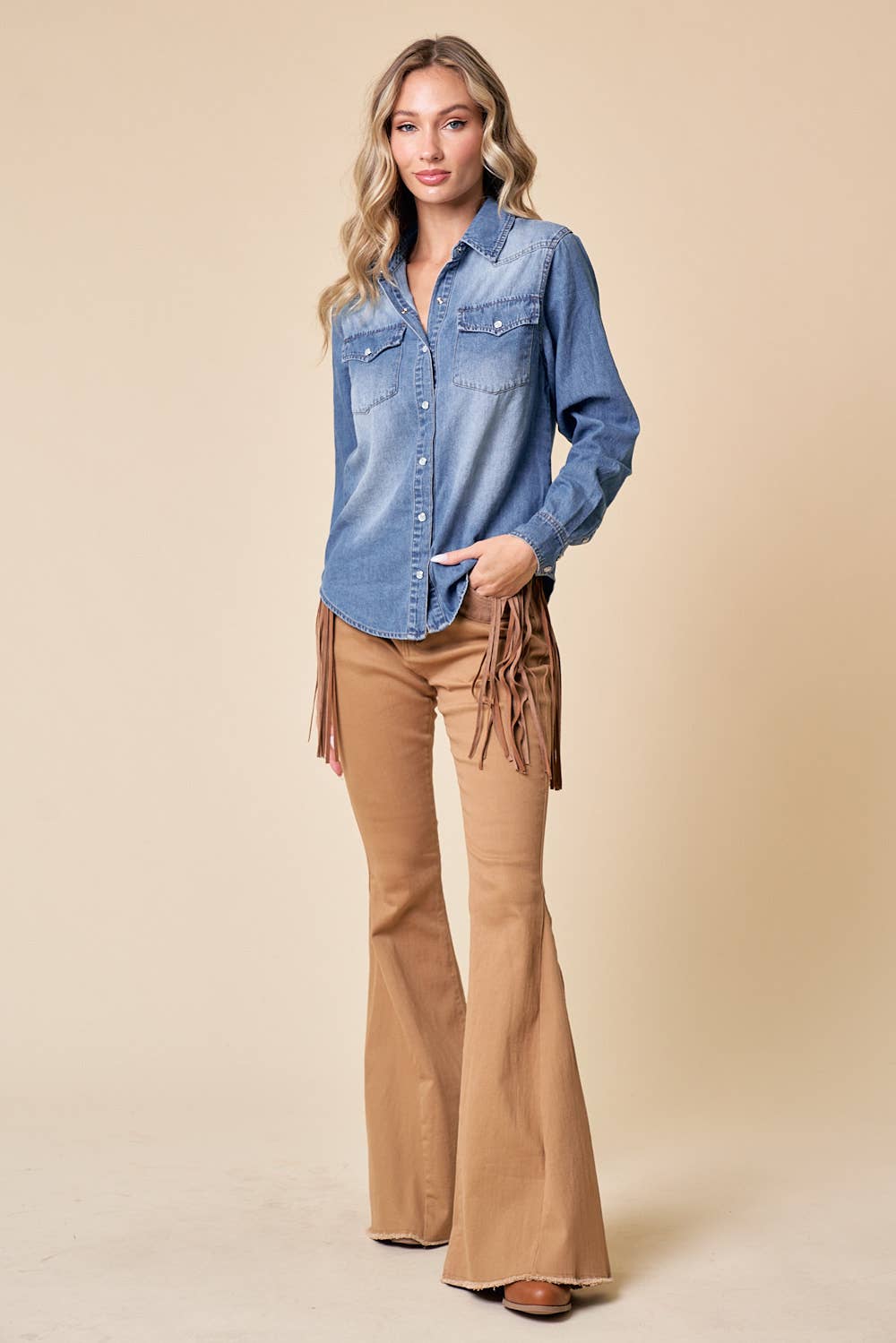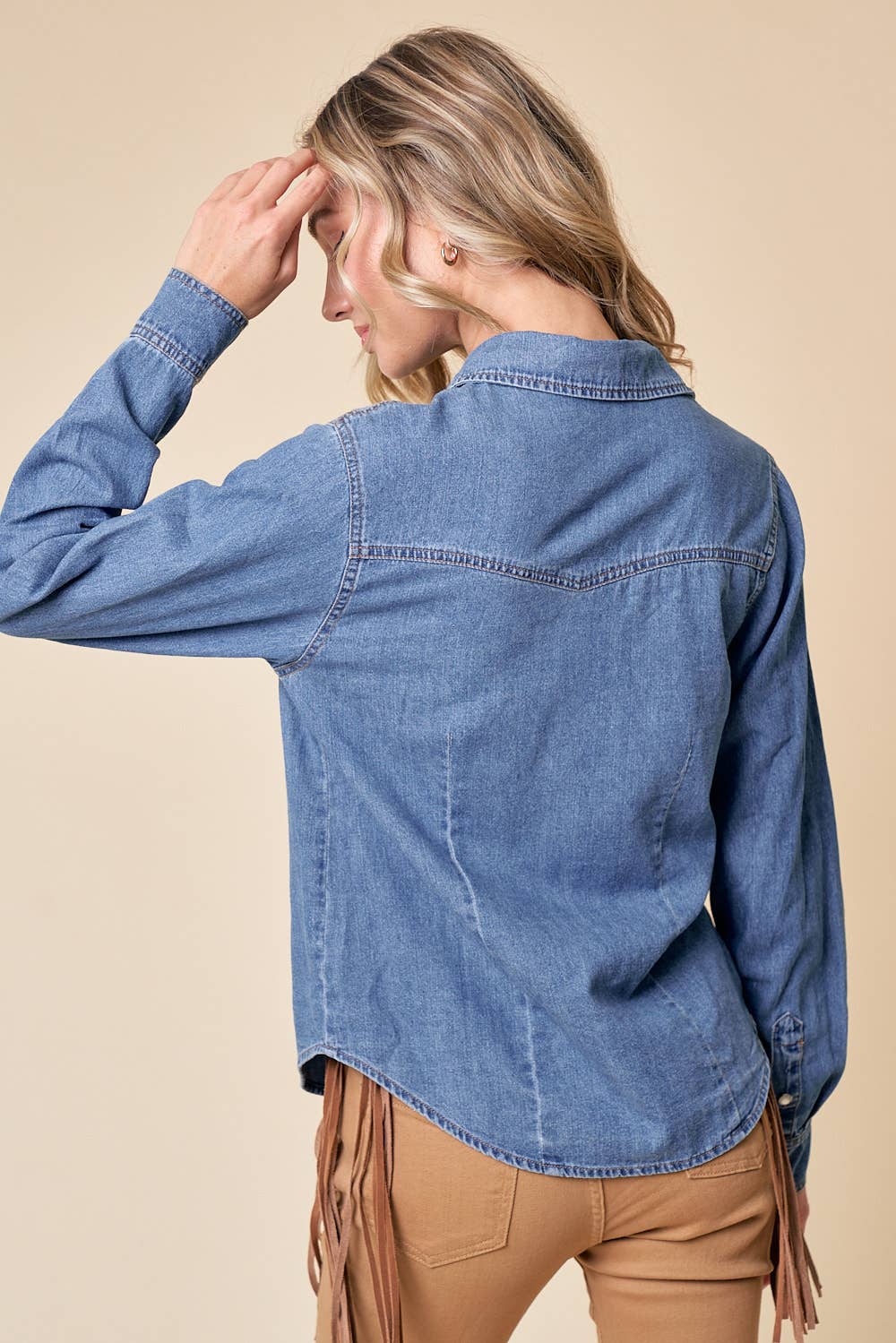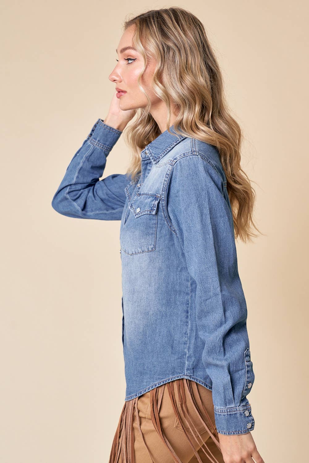 WESTERN / FALL / WINTER / RODEO / COWGIRL / COWBOY / WESTERN FASHION / BOHO / BOHEMIAN / BUTTON DOWN DENIM / DENIM TOP / COLLARED TOP / RELAXED FIT / LONG SLEEVE / SNAP BUTTONS / DATE NIGHT / NIGHT OUT / CHEST POCKETS / LIGHT WEIGHT DENIM / WASHED DENIM /