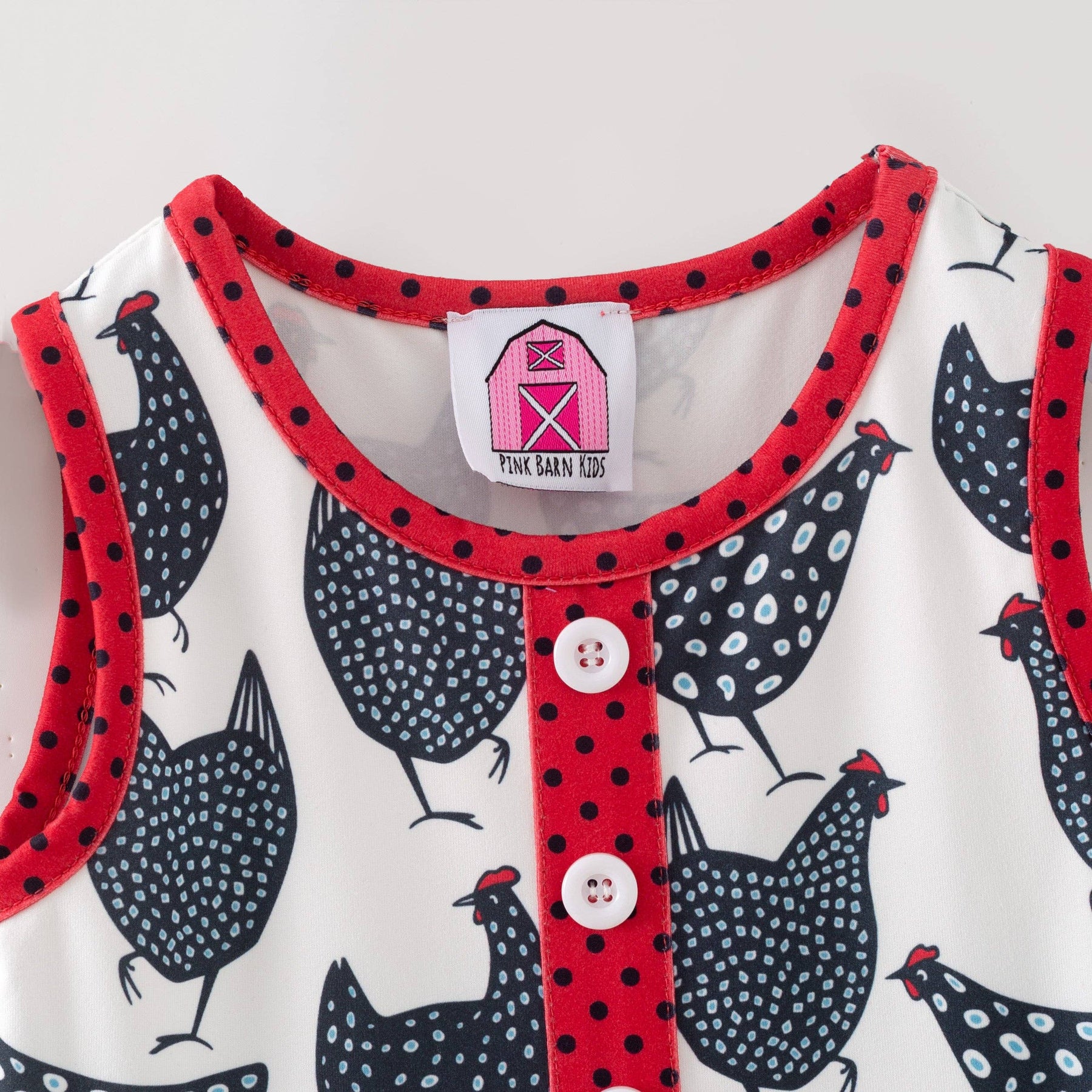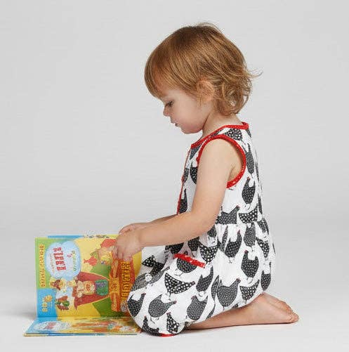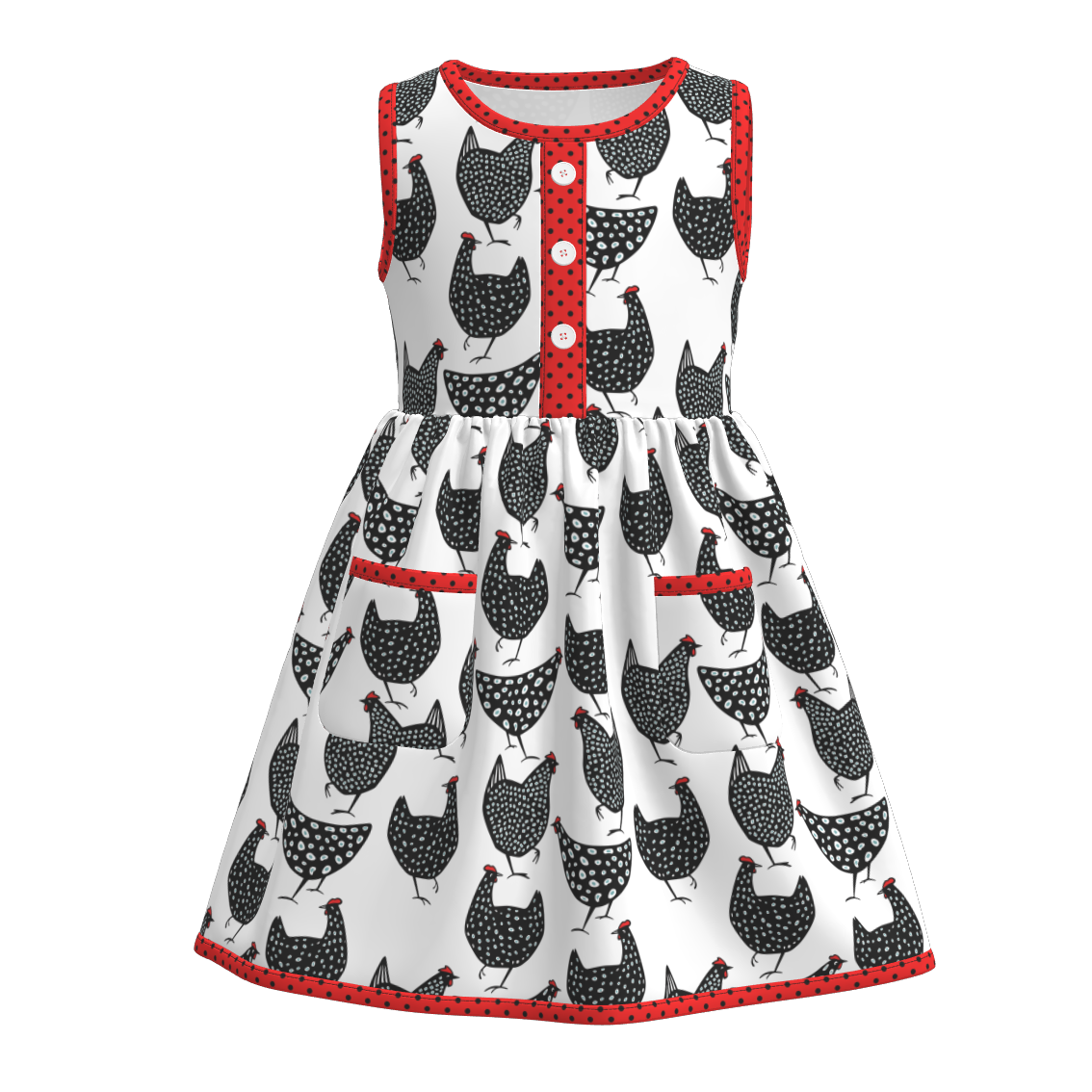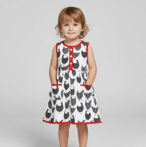This eye-catching sleeveless dress brings barnyard adventures to life with a delightful "count your chickens" design in bold black, white, and red. Perfect for little ones who love farm animals and outdoor fun, it features practical pockets—ideal for collecting treasures during playtime. The vibrant hues and playful theme make it a standout piece that celebrates childhood imagination and countryside charm. Pair it with our red polka dot leggings and chicken hoodie for cooler days.