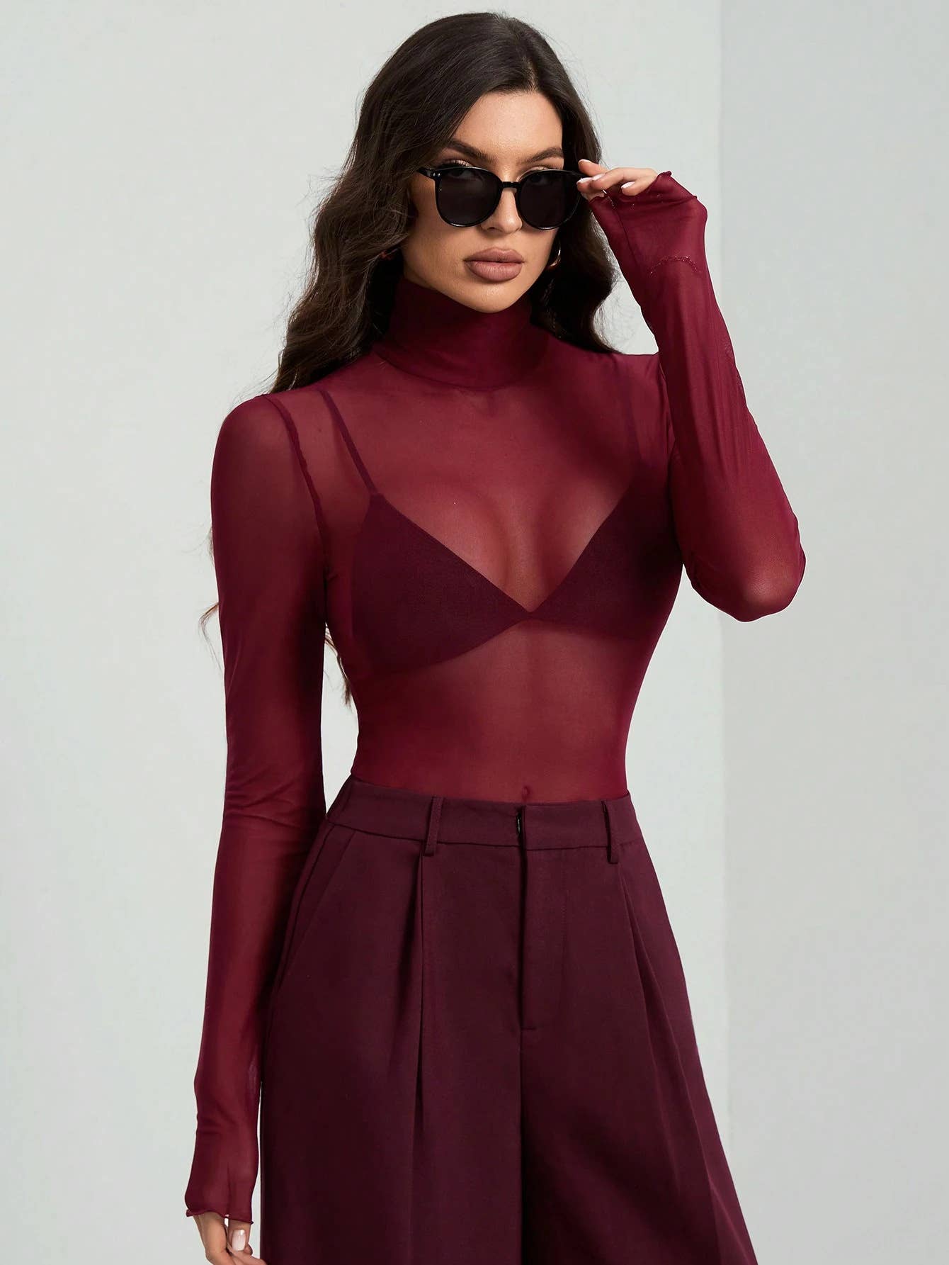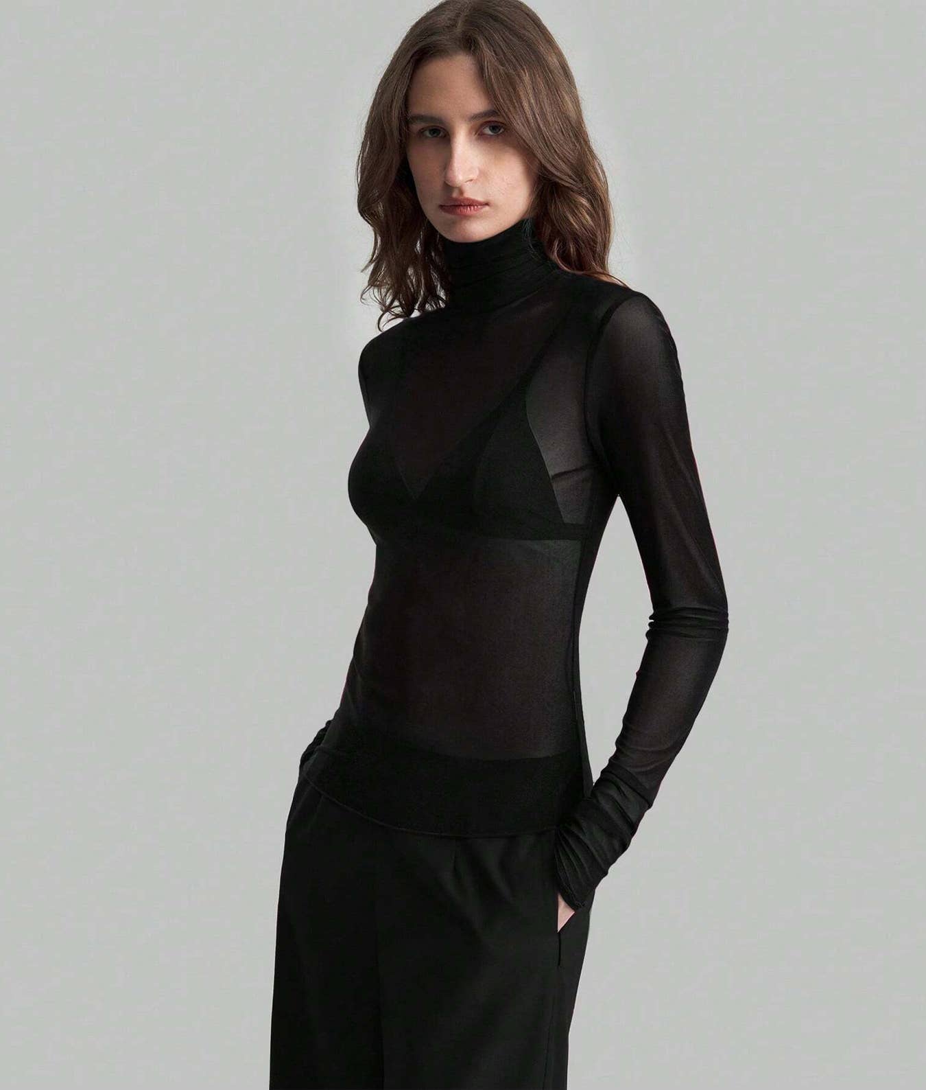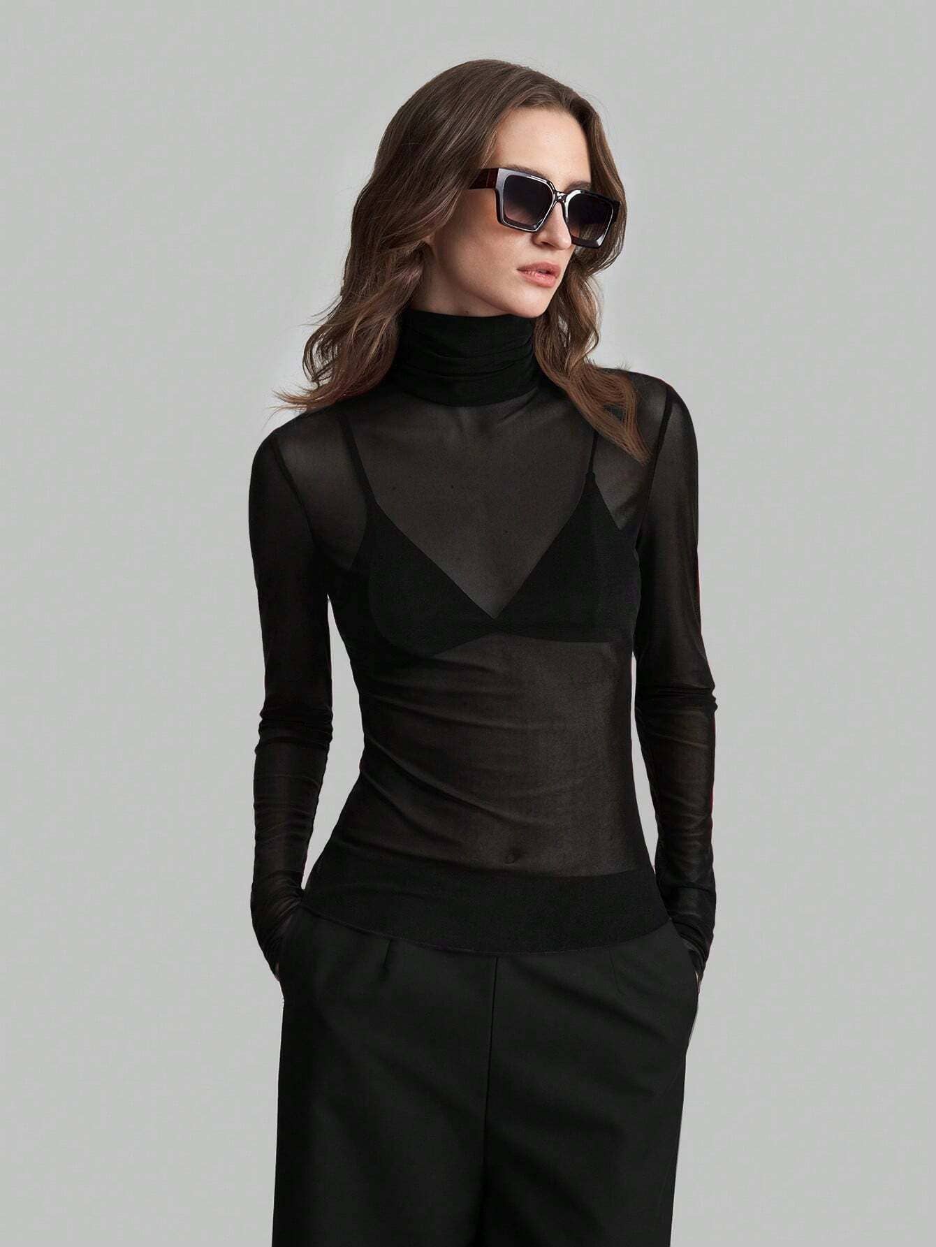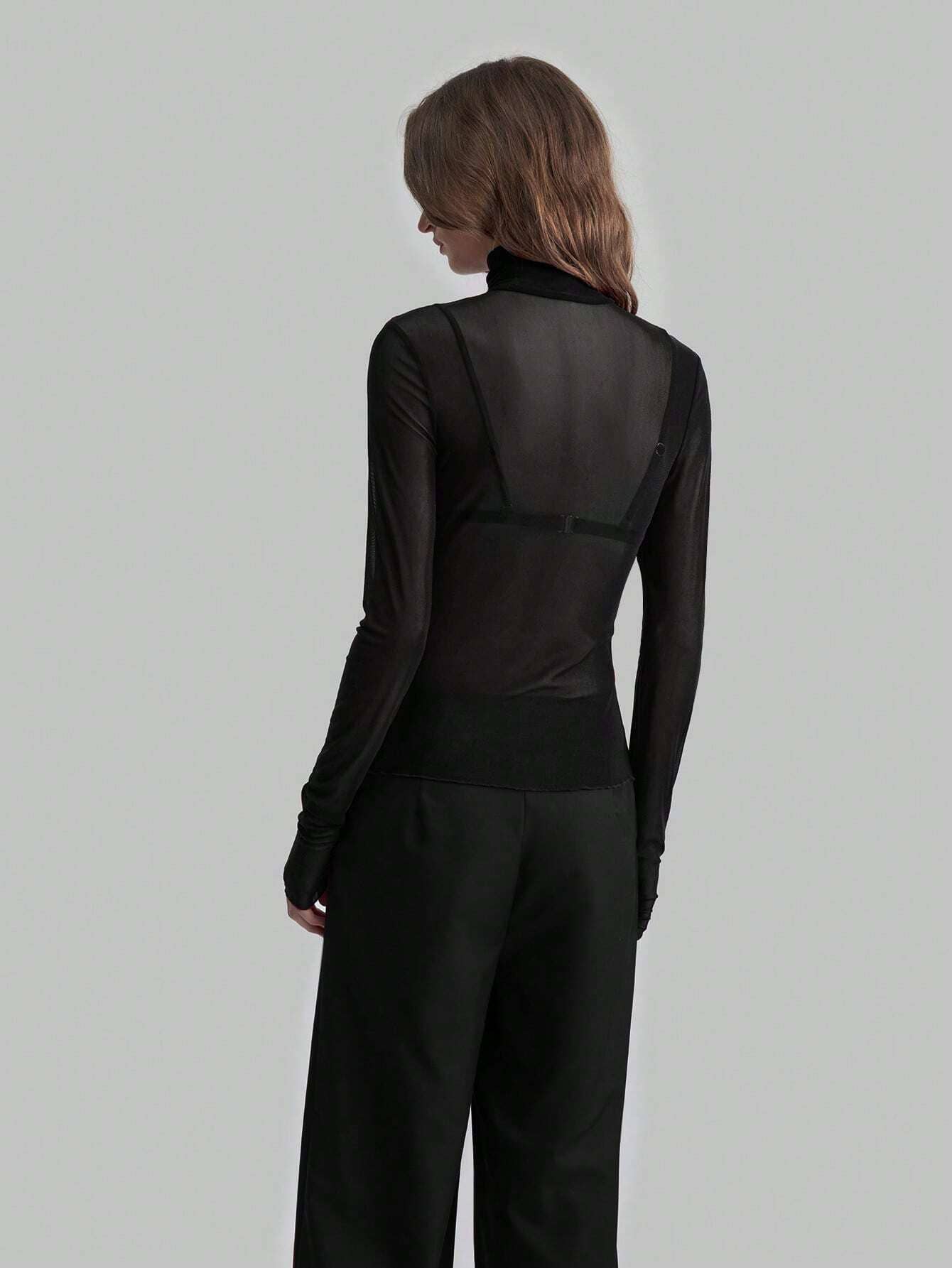 Features a sheer, long-sleeved turtleneck design, perfect for stylish layering or a chic stand-alone look.