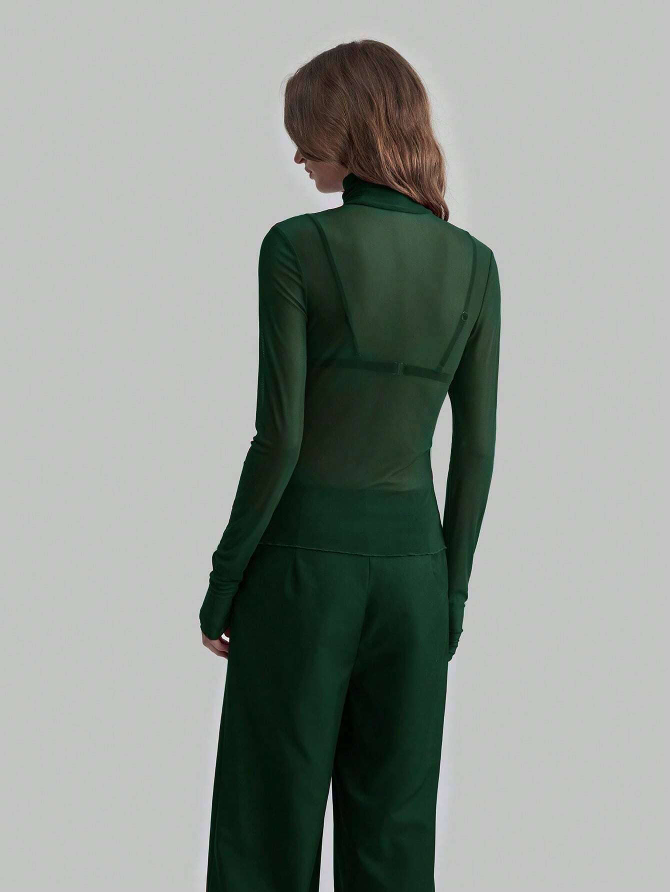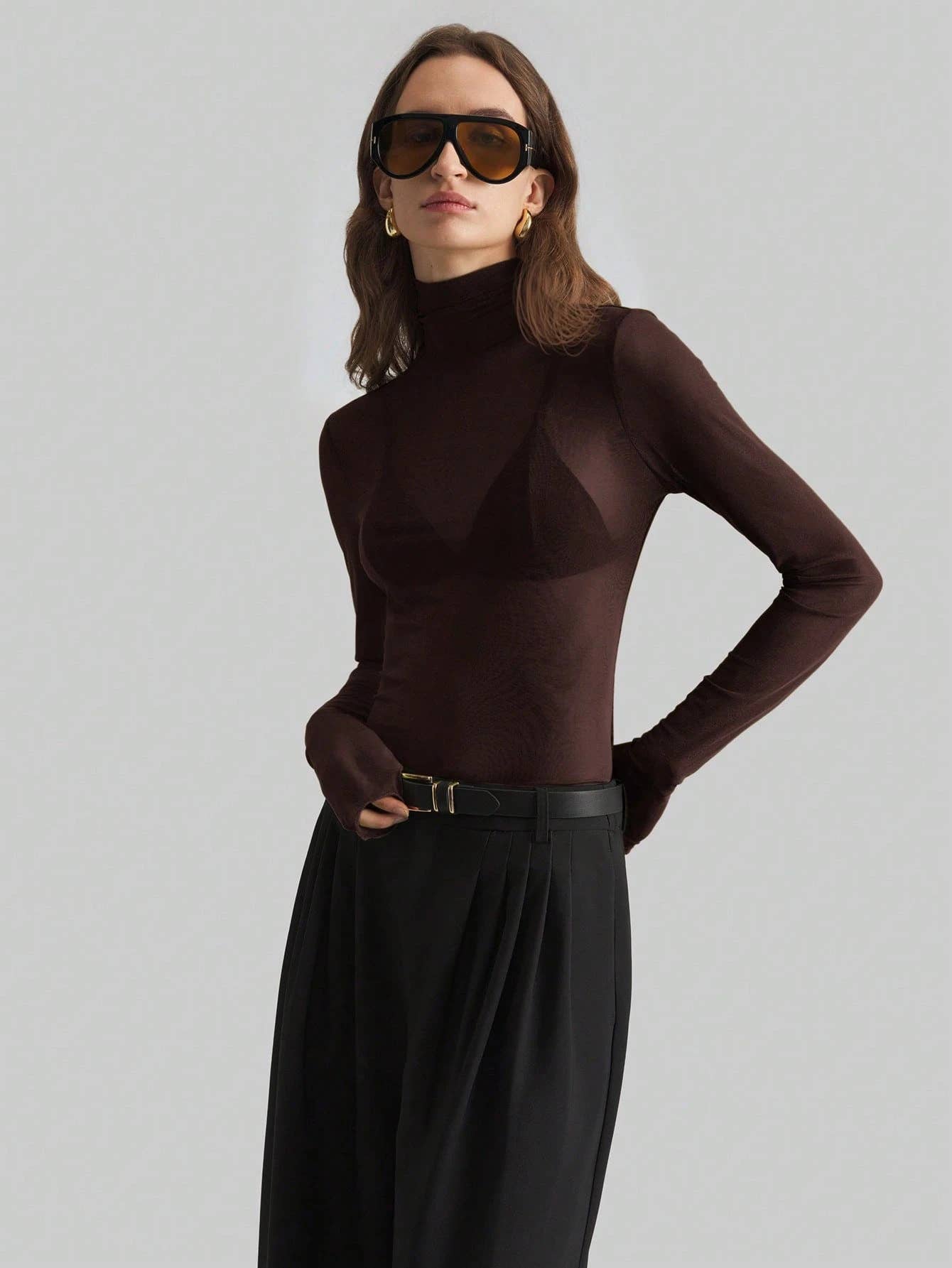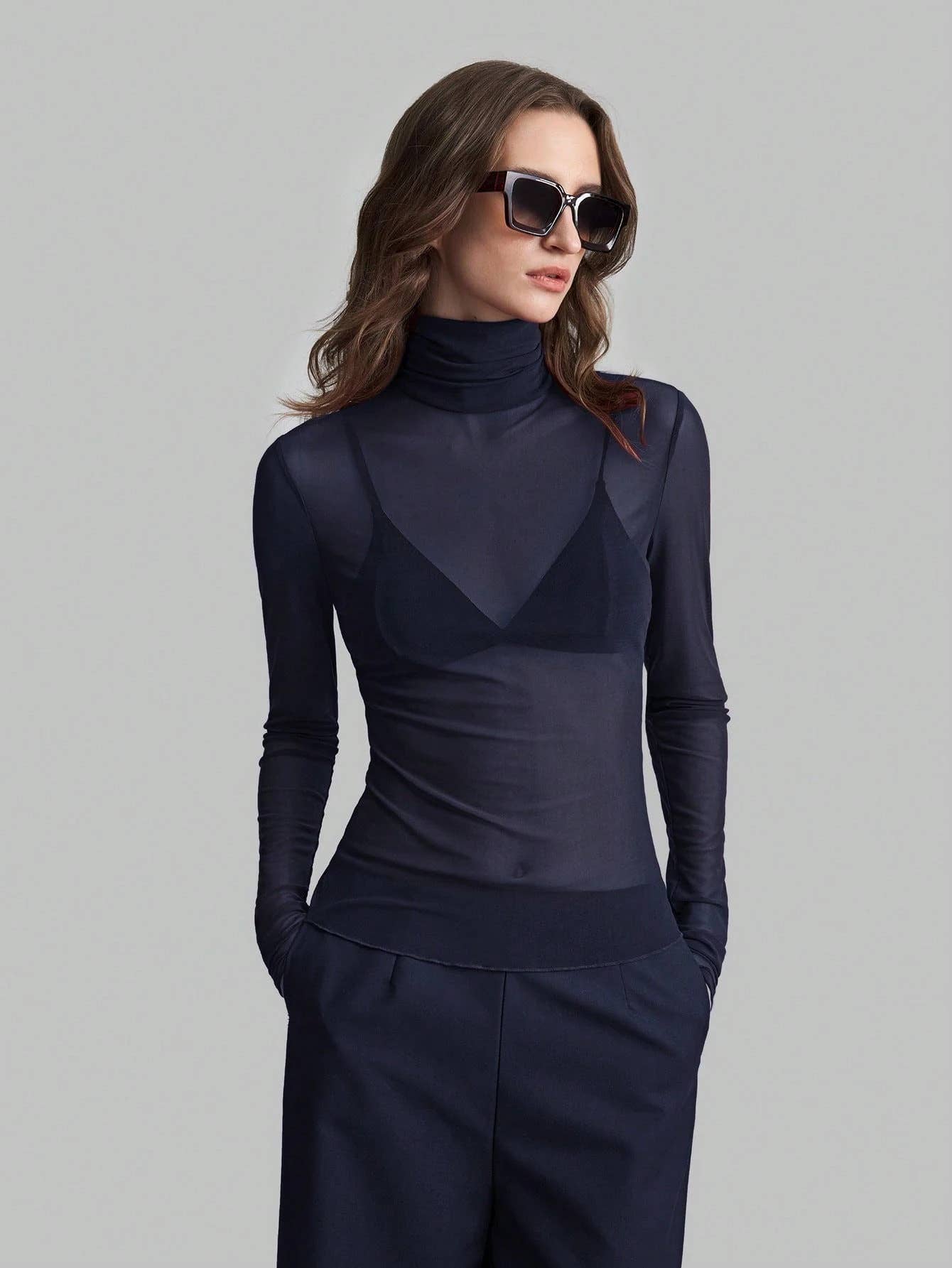 Features a sheer, long-sleeved turtleneck design, perfect for stylish layering or a chic stand-alone look.