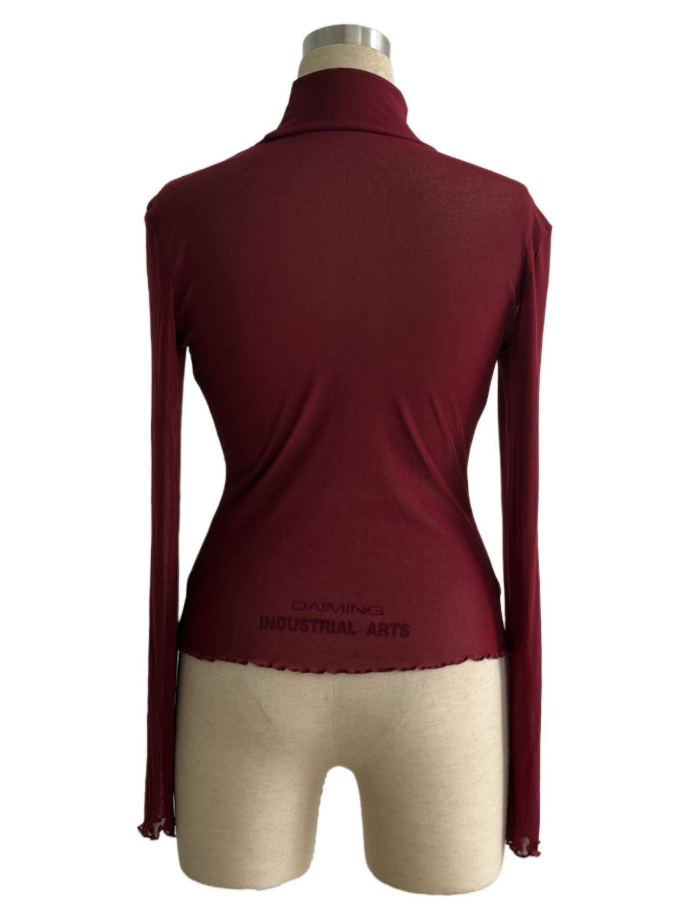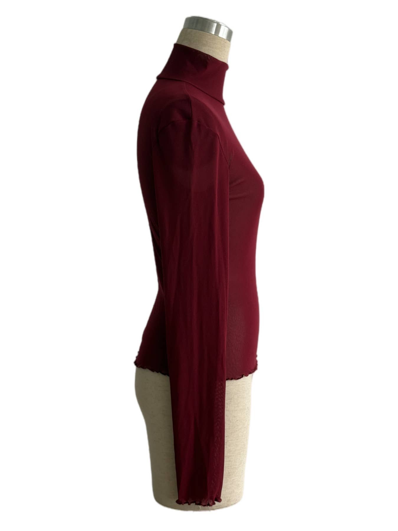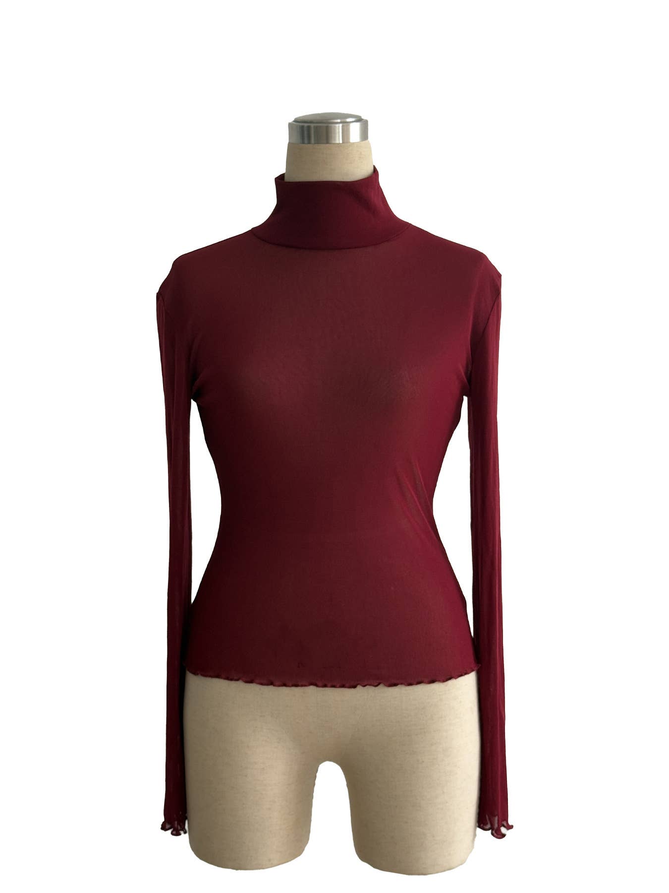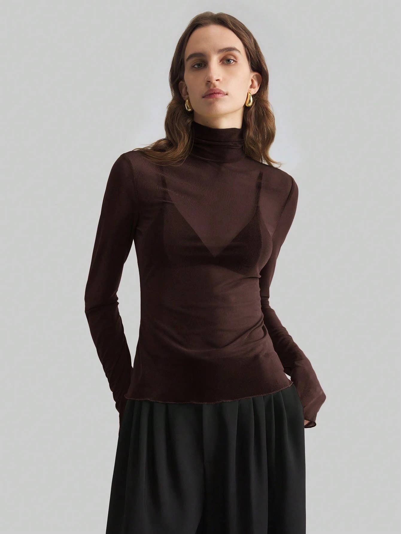 Features a sheer, long-sleeved turtleneck design, perfect for stylish layering or a chic stand-alone look.