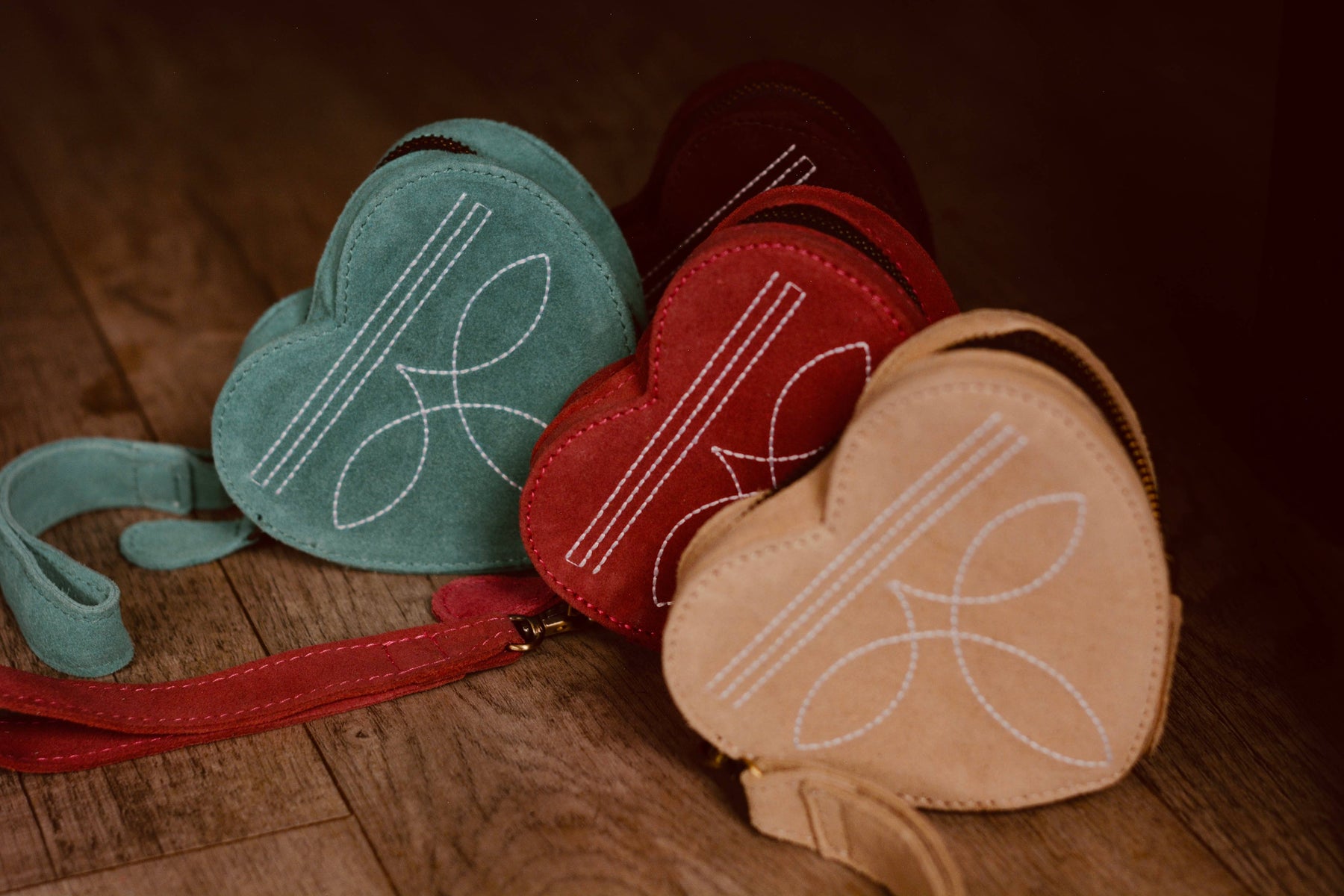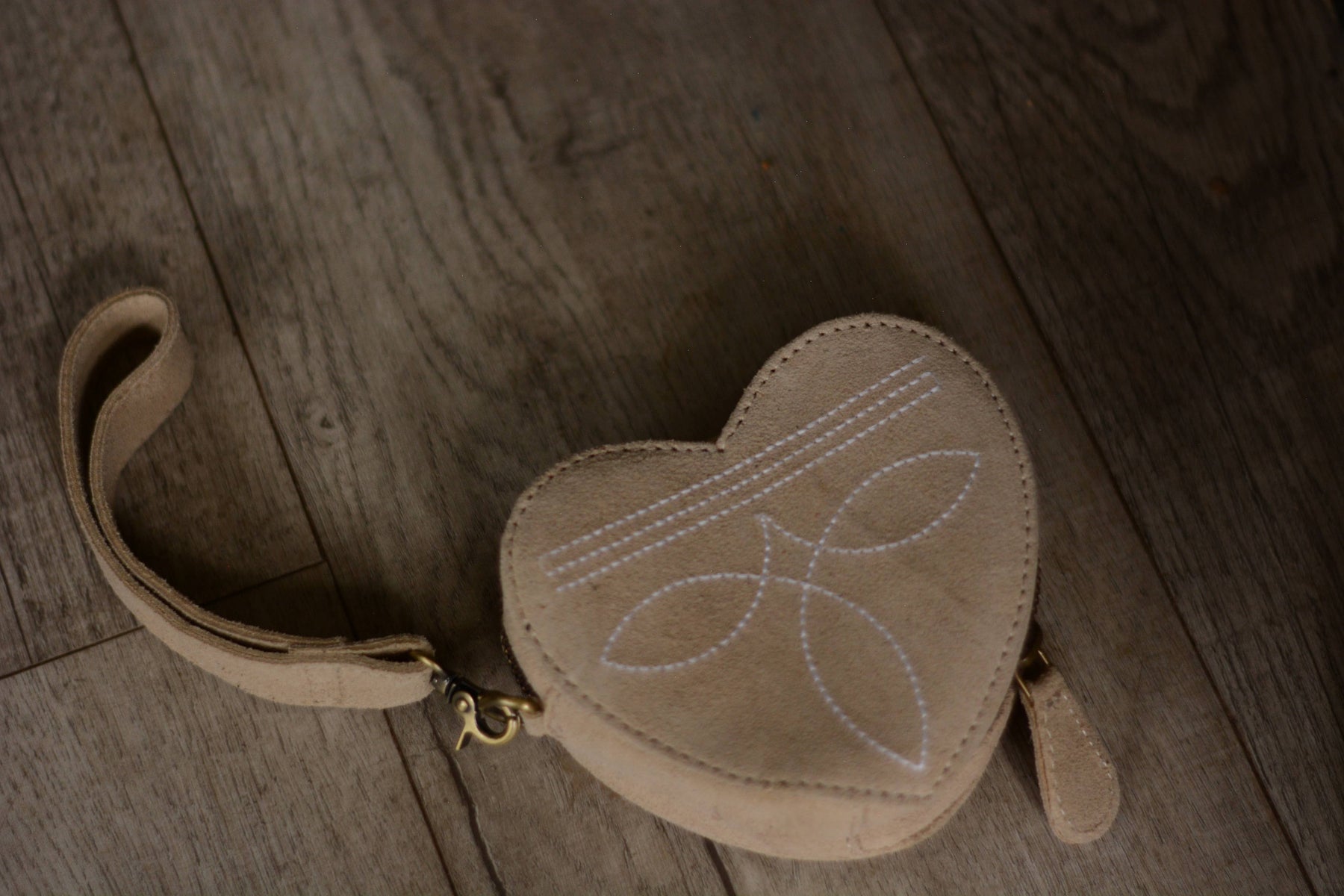 Carry a little love wherever you go. The Heartline Case is a soft suede wristlet shaped like a heart and stitched with a signature western-inspired design. Compact yet functional, it holds your small essentials — cards, cash, lip balm, and more — all in a 5x5x2-inch silhouette.